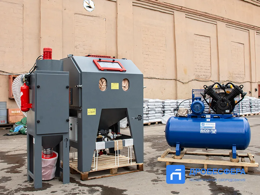 Среди представленных на рынке абразивоструйного оборудования комплектов кабин с компрессорами в наборах оборудования встречаются: