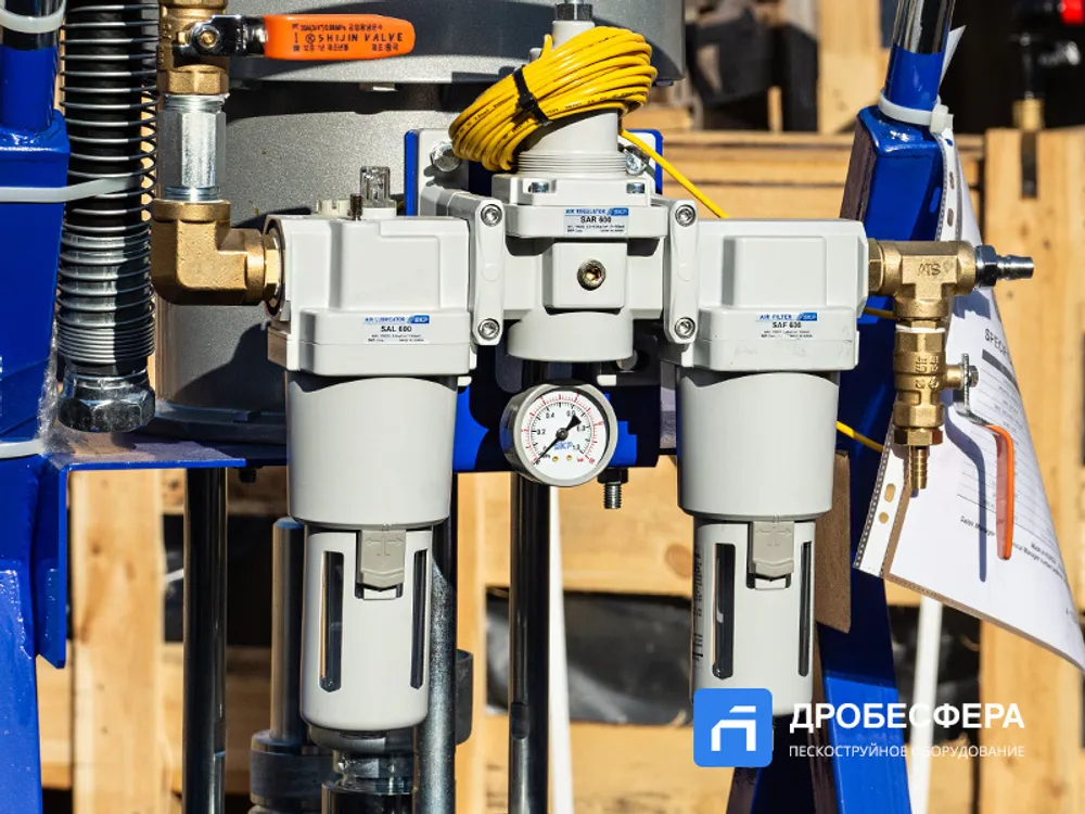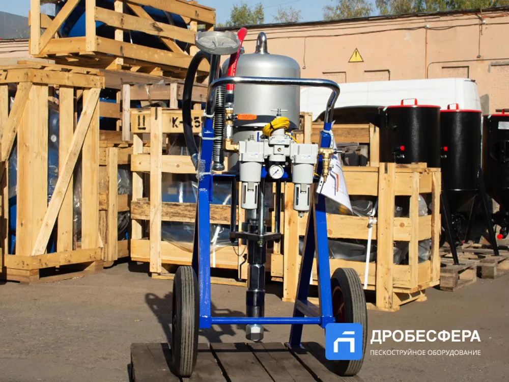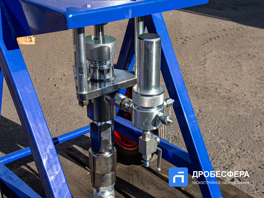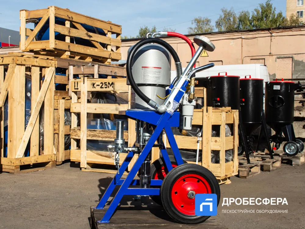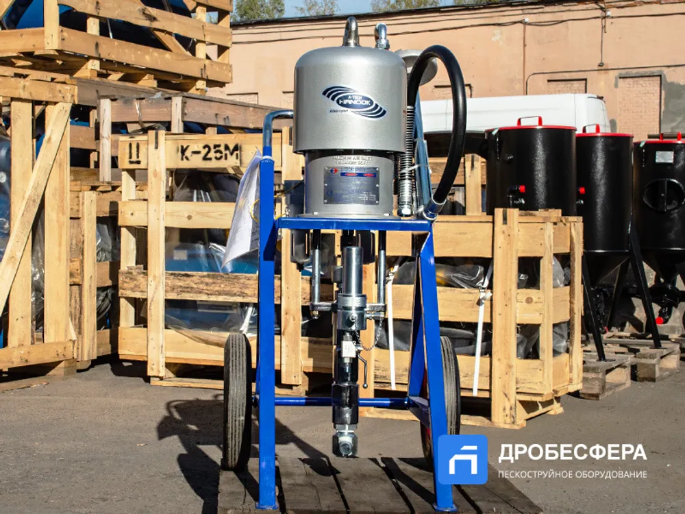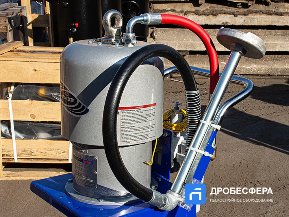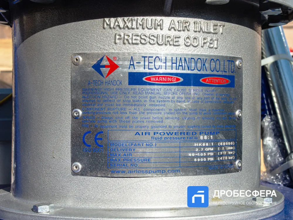 Окрасочный аппарат HANDOK HK 68:1 работает от 2-3 кубового компрессора, создающего давление воздуха от 2-х до 8 атм. Распыление краски осуществляется через специальный краскопульт высокого давления.
