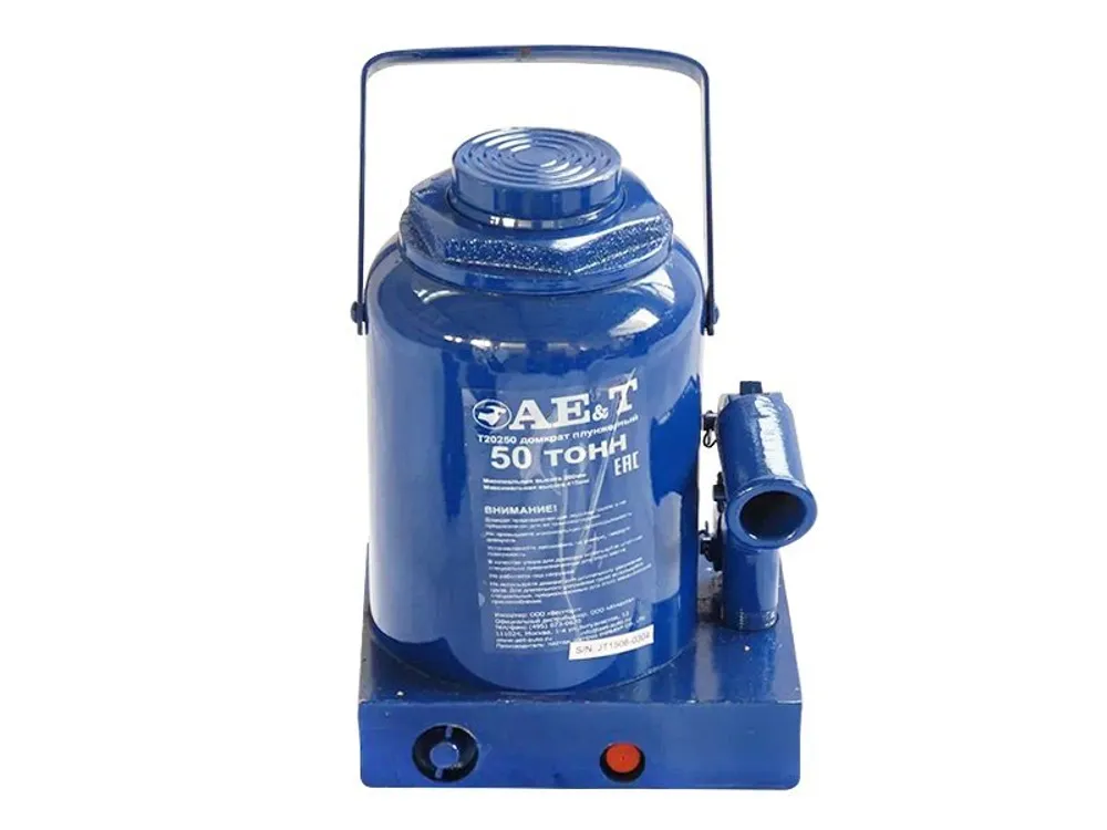 Работа по обслуживанию и ремонту серьезных механизмов, спецтехники, коммерческого и грузового транспорта, самолетов, необходимость перемещения временных объектов, используемых на строительных площадках (бытовки, гаражи) и прочих конструкций сопряжены с необходимостью вывешивания колес, подъема. С этими функциями успешно справляется китайский бутылочный домкрат AE&T T20250 гидравлического типа, обеспечивающий усилие до 50 тонн.