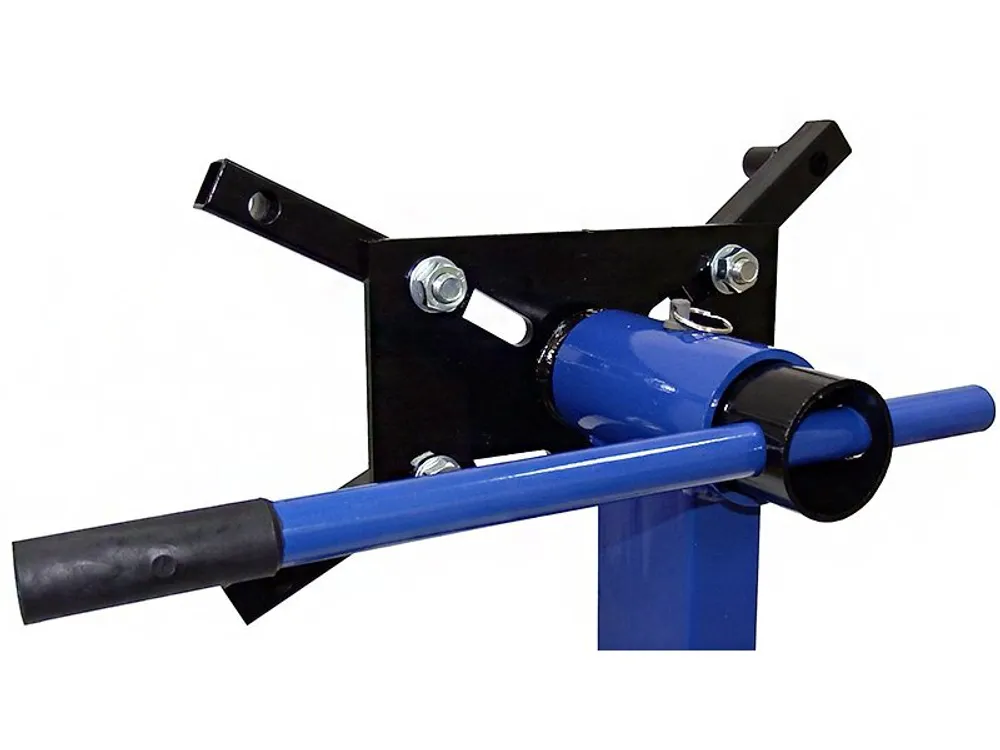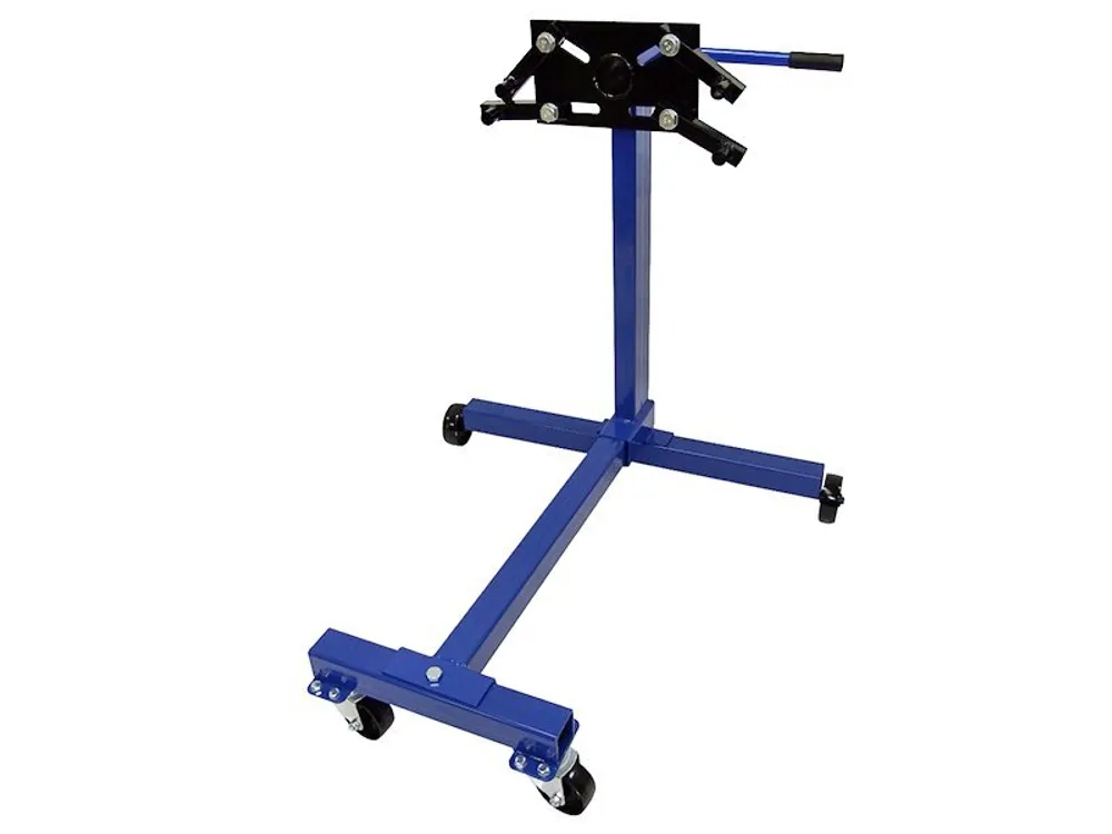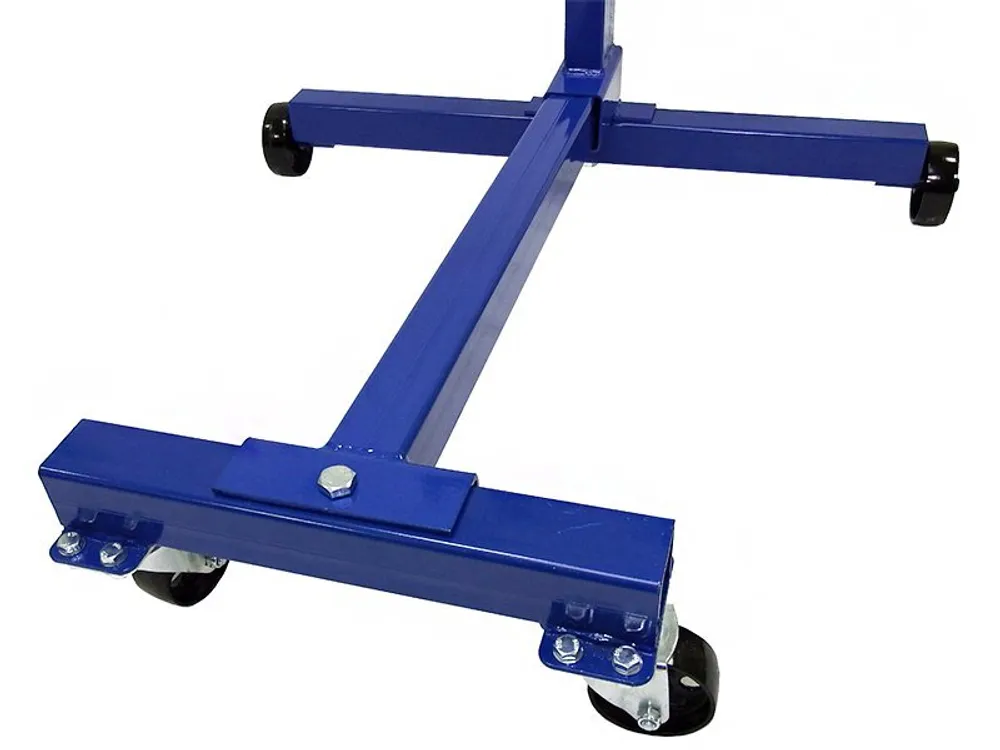 Агрегат выполнен из толстостенной стали, стойки оснащены надежными колесами, которые обеспечивают мобильность даже при закрепленном моторе весом до 450 кг. Поворотная на 360° крестовина фиксируется в шести возможных положениях.