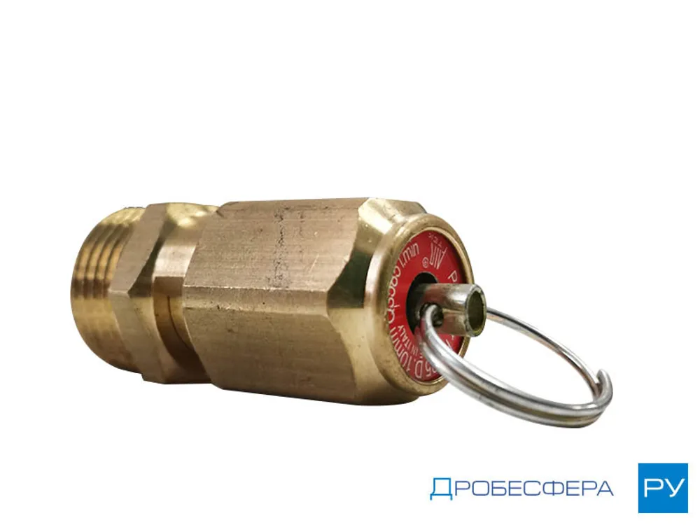 Компонент рассчитан на рабочее давление 8 бар и срабатывает при превышении этого показателя. Клапан устанавливается на ресивер, на котором смонтирован компрессорная головка с электродвигателем.