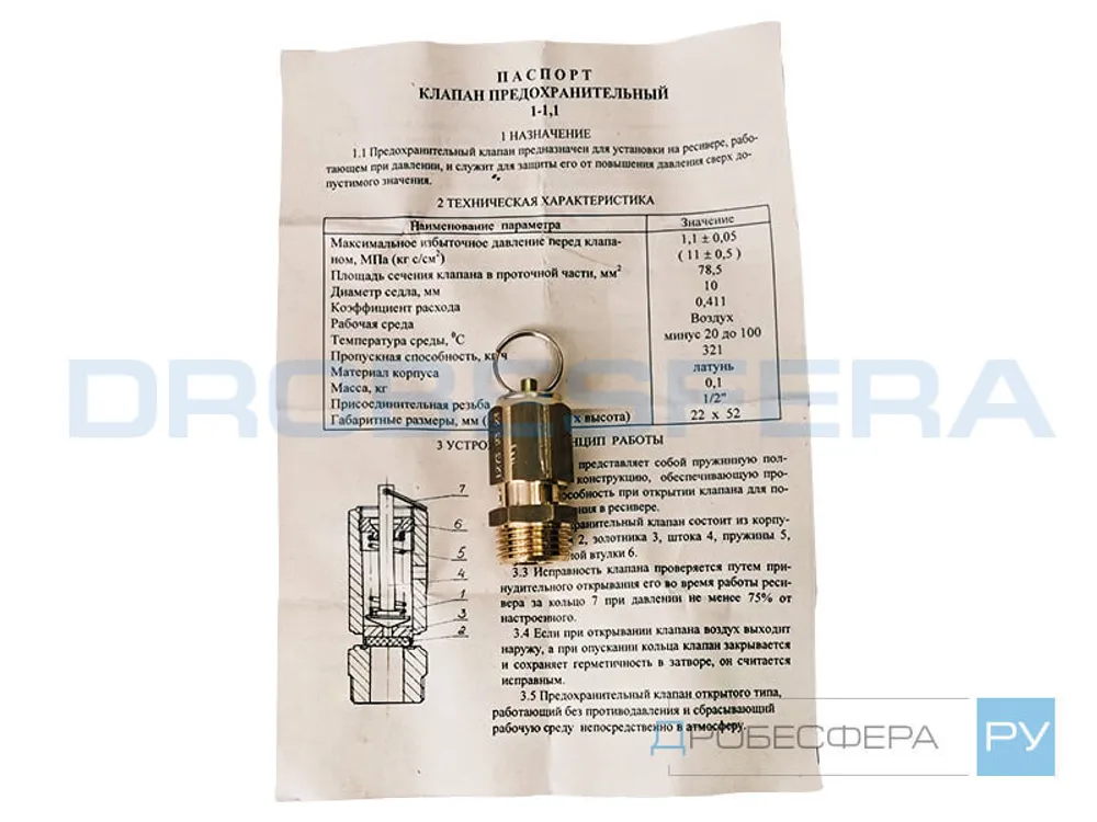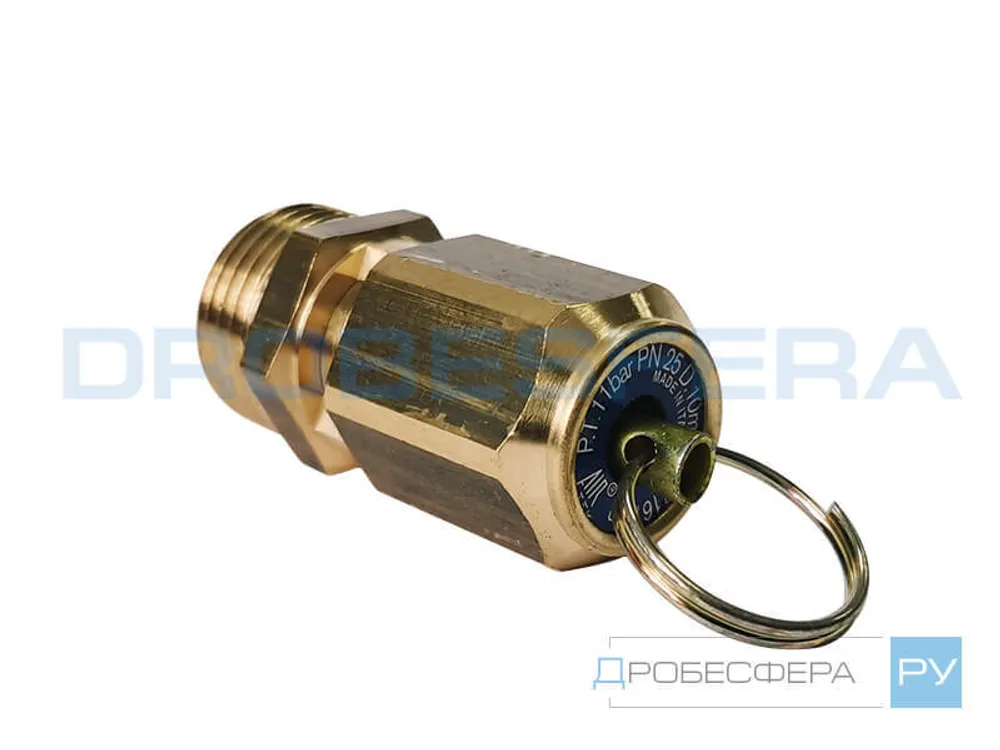 Безопасность эксплуатации агрегата, находящегося под давлением, обеспечивается предохранительными клапанами типа К3.03.00.200 1,1МПа 1/2" (артикул в спецификации 3993259), который устанавливается на ресивер путем вкручивания посредством полудюймовой резьбы.