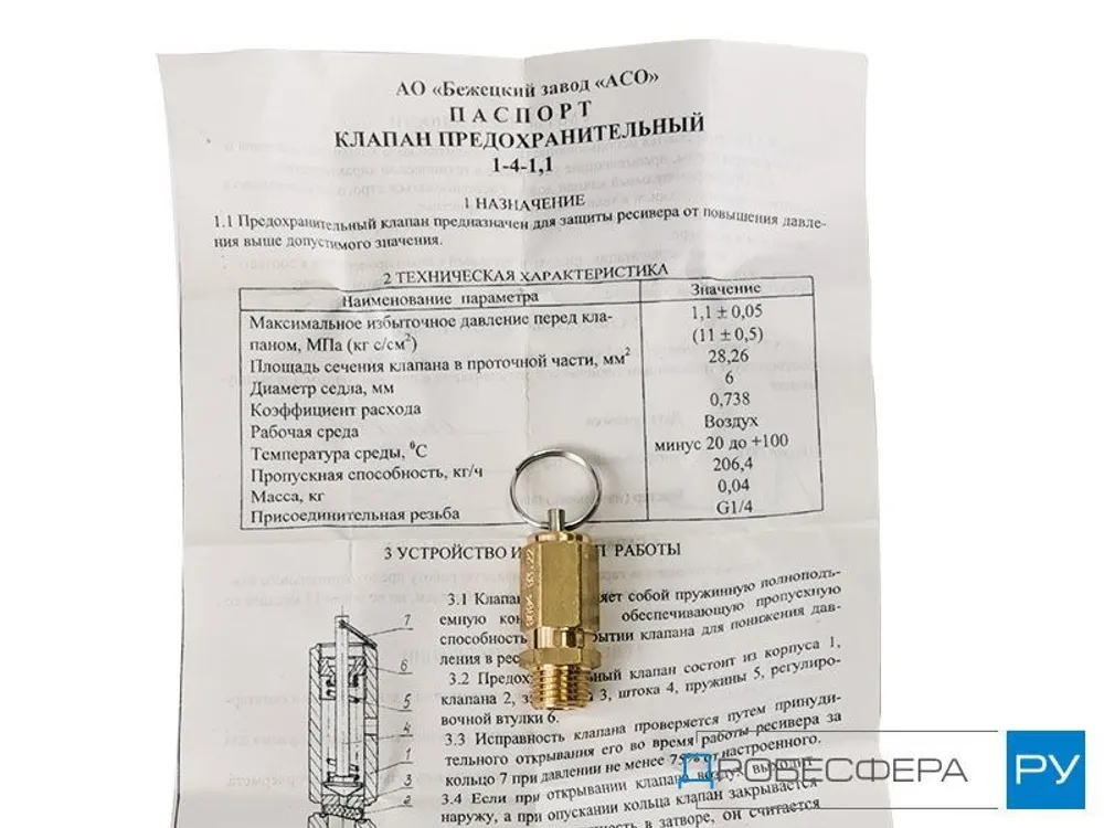 Он используется в компрессорах, оснащенных пневмоголовками С415М, Бежецкого завода АСО. Предохранительный клапан выполняет функции контроля максимального уровня компрессии в пневмомагистрали.