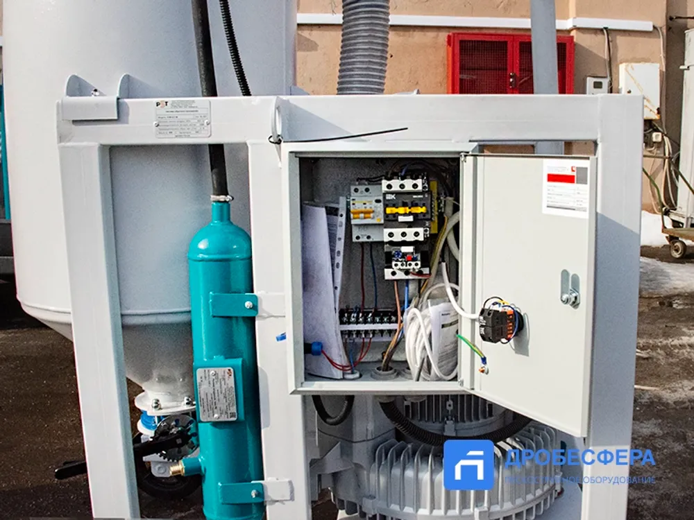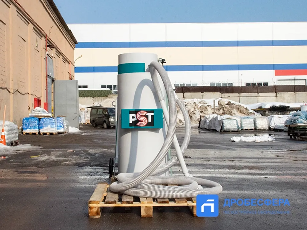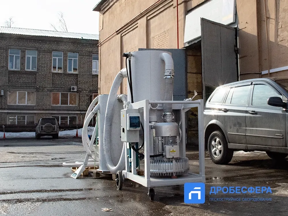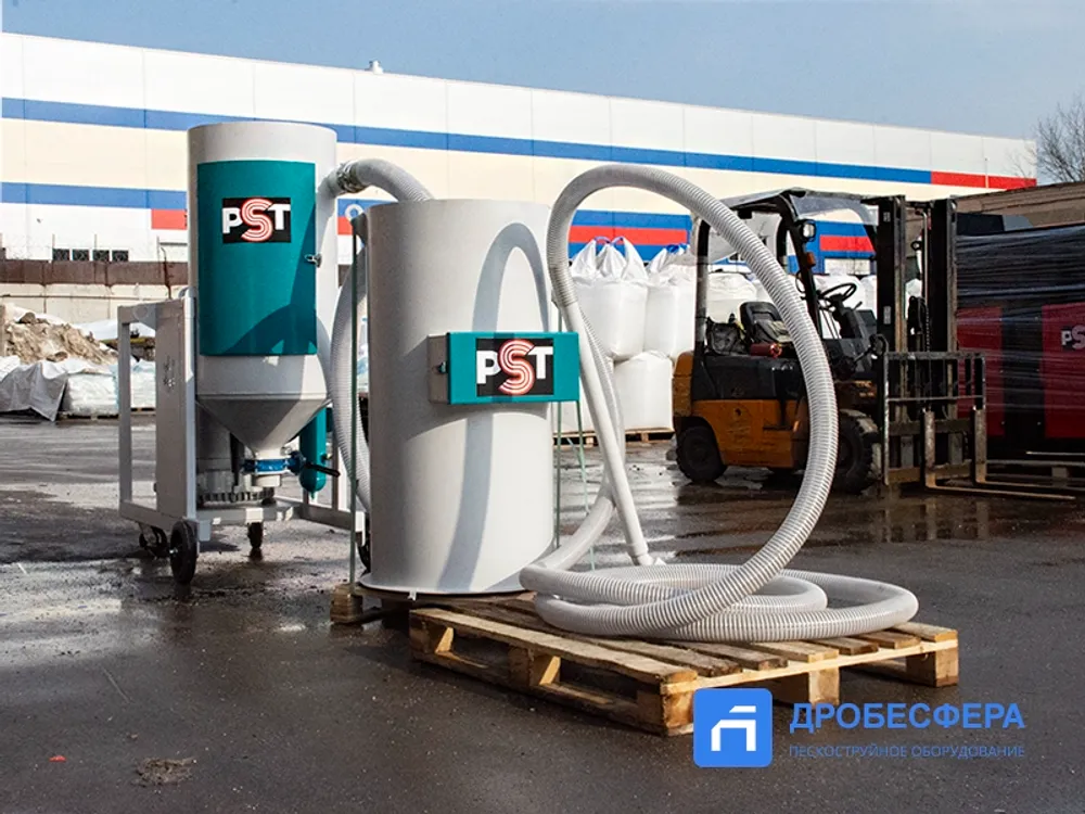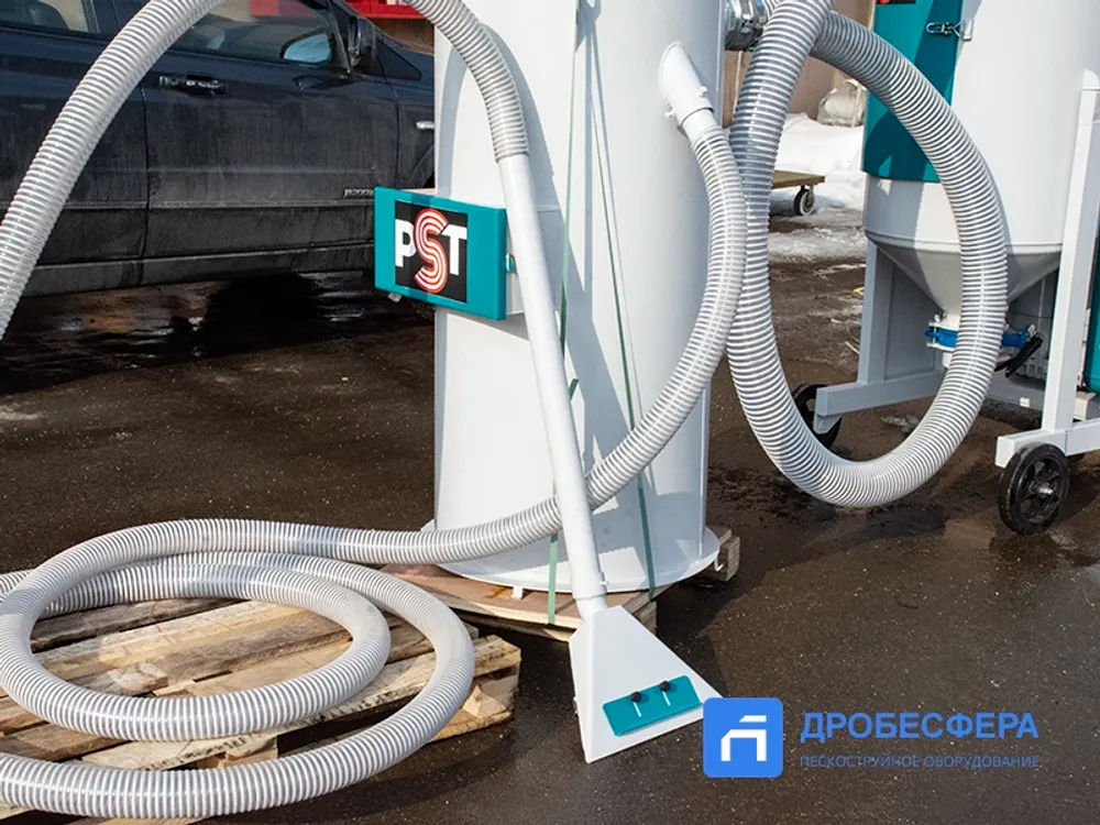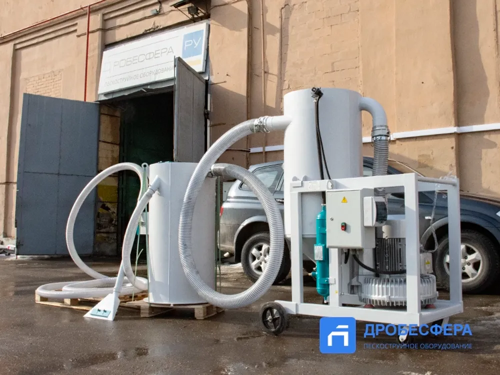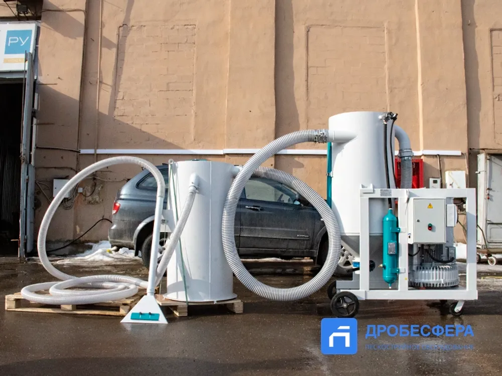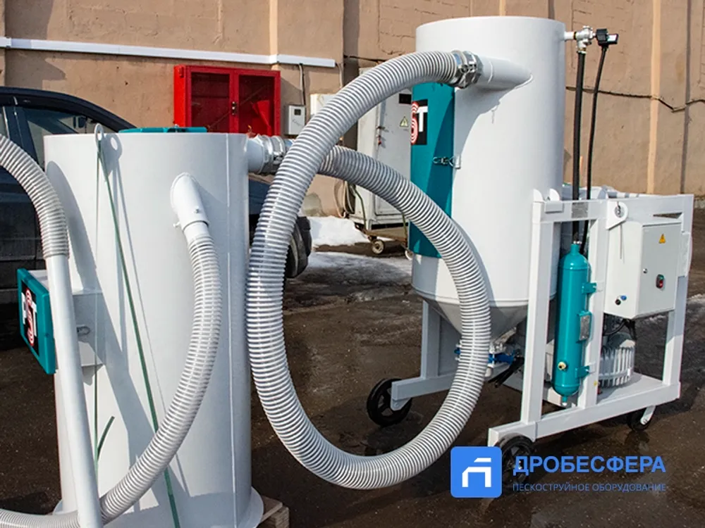 Собранный абразив подвергается очистке от пыли и мусора, а также отделению абразива крупной (рабочей) фракции от мелкой пыли, которая также собирается вакуумом. В комплектацию системы входит вакуумная система, рекуператор с емкостью 200 литров, циклон, а также комплект всасывающих рукавов длиной 8 метров и две насадки.