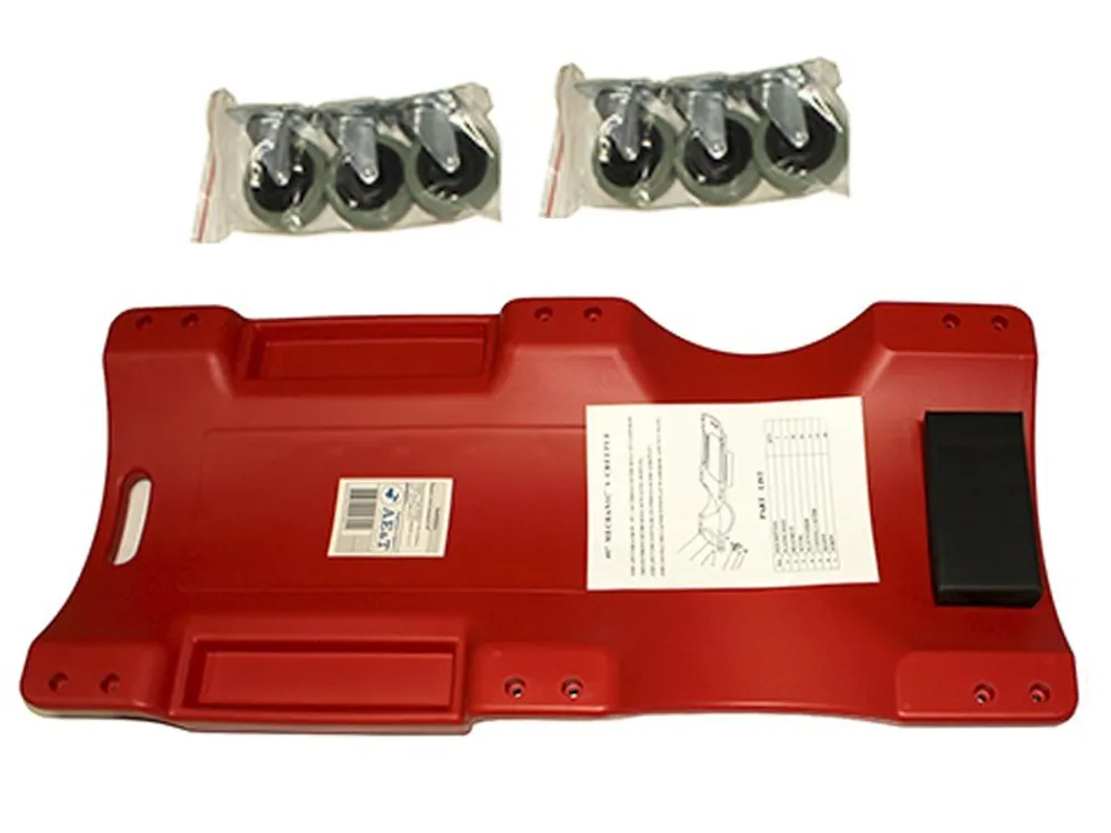 Высоким спросом при большой проходимости автомобилей с проблемами, которые устраняются при работе под днищем, обусловливают спрос на такое вспомогательное оборудование для автосервиса как китайские подкатные пластиковые лежаки 40" AE&T TA-B1035-C. Они позволяют избежать проблем с профессиональными заболеваниями мастеров, обеспечивая комфортные условия при работе.