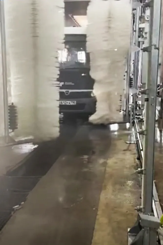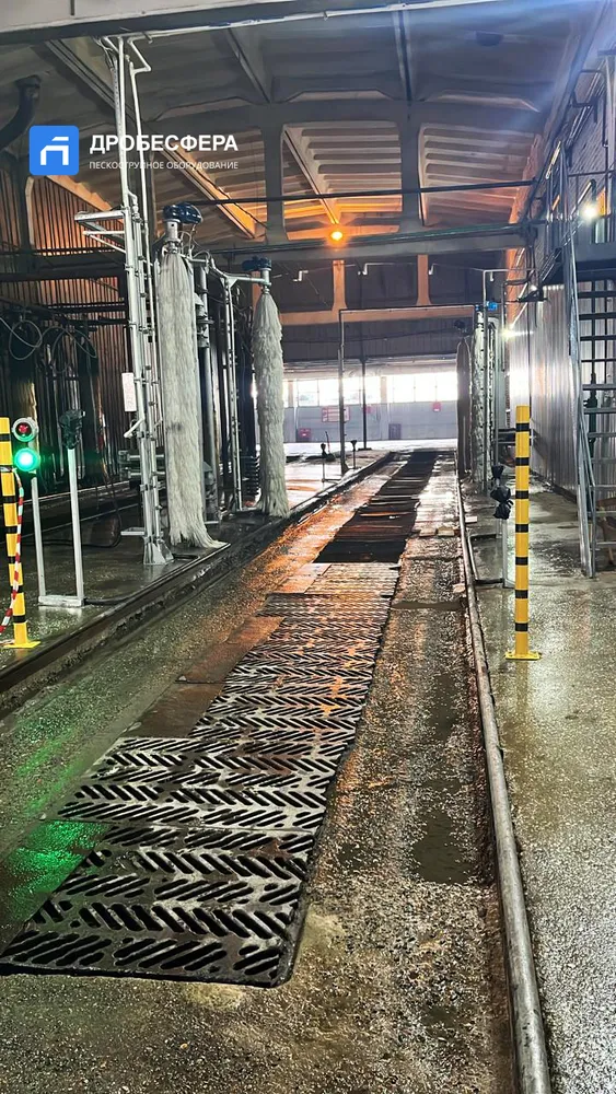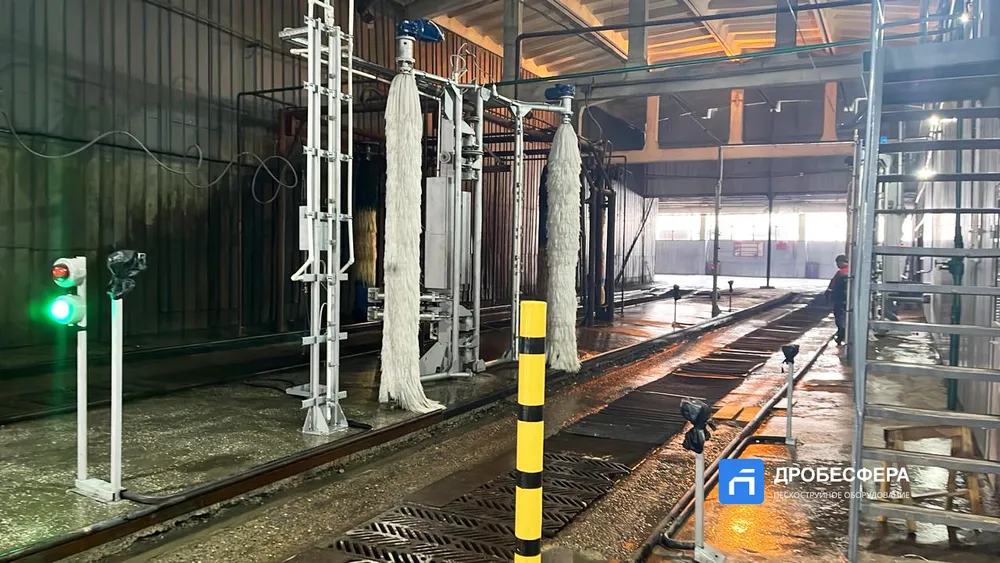 Мойка не требует рельс, представляет собой проходную установку, где транспорт обмывается при движении между щеточными валами.