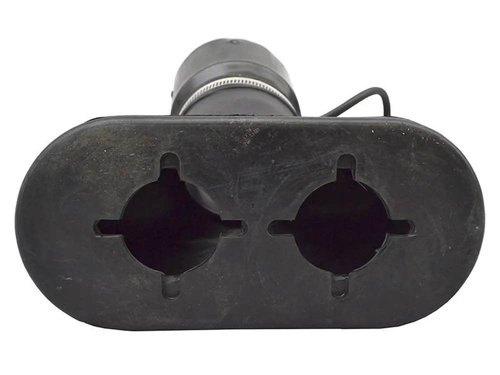 Наконечник имеет два отверстия для соединения со сдвоенной выхлопной трубой автомобиля, которые сводят выхлопные газы в один шланг отвода выхлопов. Устройство выполнено из прочной вулканизированной резины и выдерживает термическую нагрузку при выхлопе.