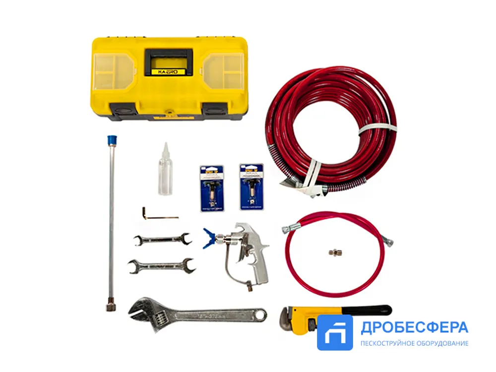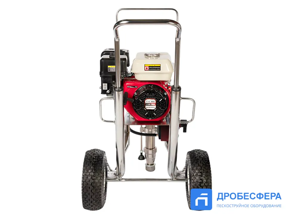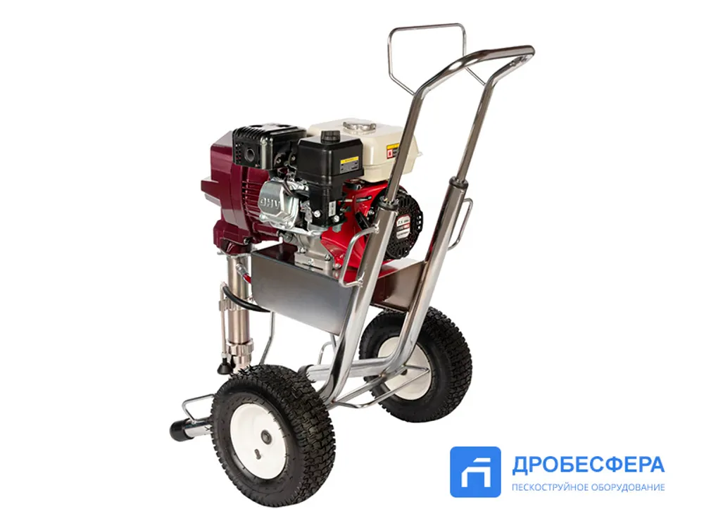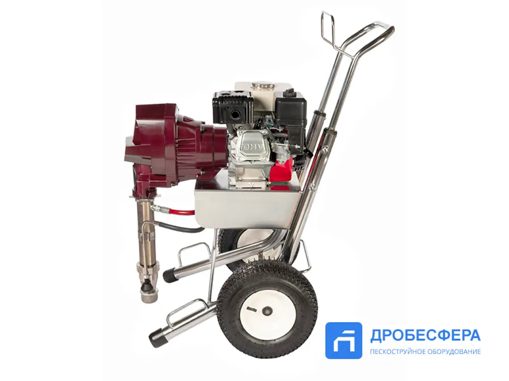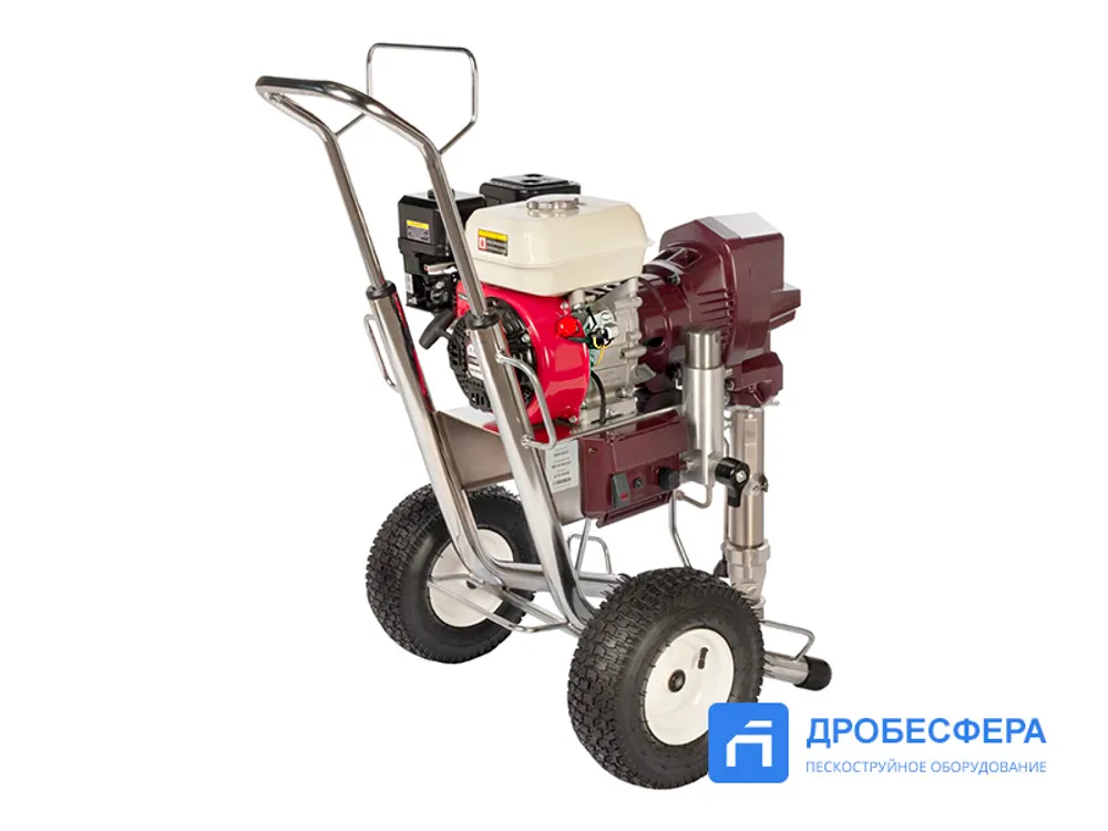 Агрегат представляет собой установку безвоздушного распыления, которая обеспечивает процесс подачи рабочего состава на высоту до 15 метров, создавая давление материала 227 бар.
