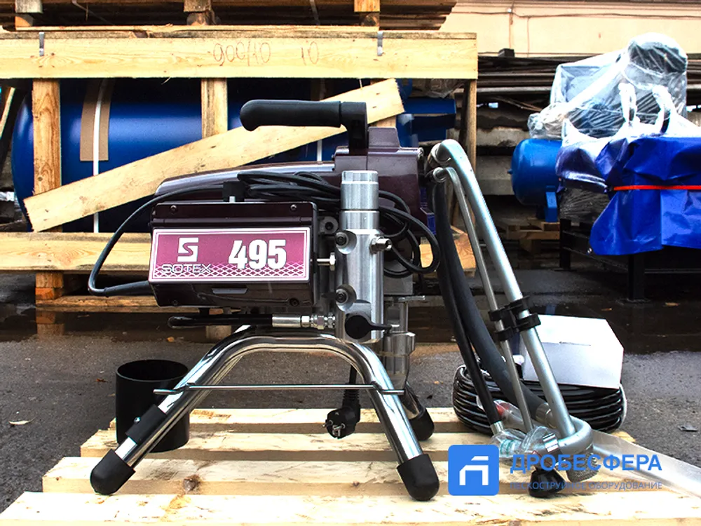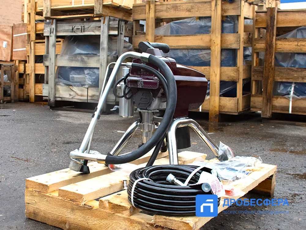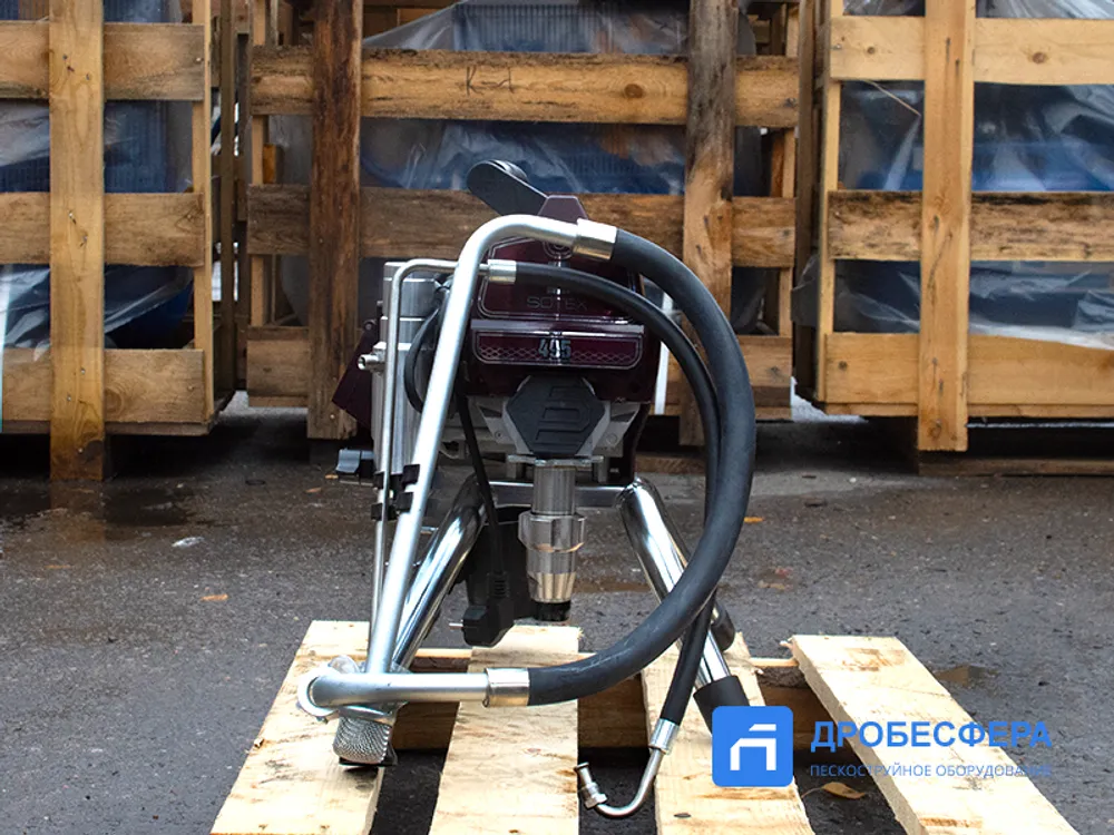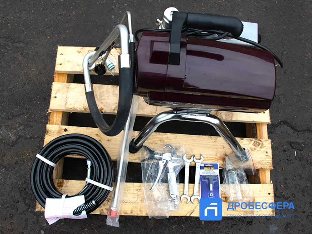 Окрасочный аппарат комплектуется постом со шлангом высокого давления ¼” длиной 15 метров. Максимальная возможная длина шланга может достигать 30 метров. Создаваемое давление до 227 бар обеспечивает подачу состава через краскораспылитель, который входит в комплектацию вместе с соплодержателем и набором сопел. Максимальный диаметр сопла может достигать 0,025“.