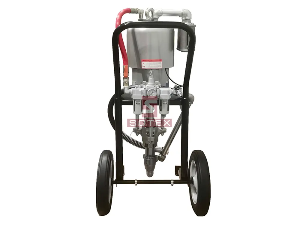 Модель представляет собой мобильную установку, в состав которой входит насос соотношением 68:1 на колесной тележке. Транспортировочная ручка и наличие колес обеспечивают возможность передвижения окрасочного аппарата в пределах рабочей площадки.