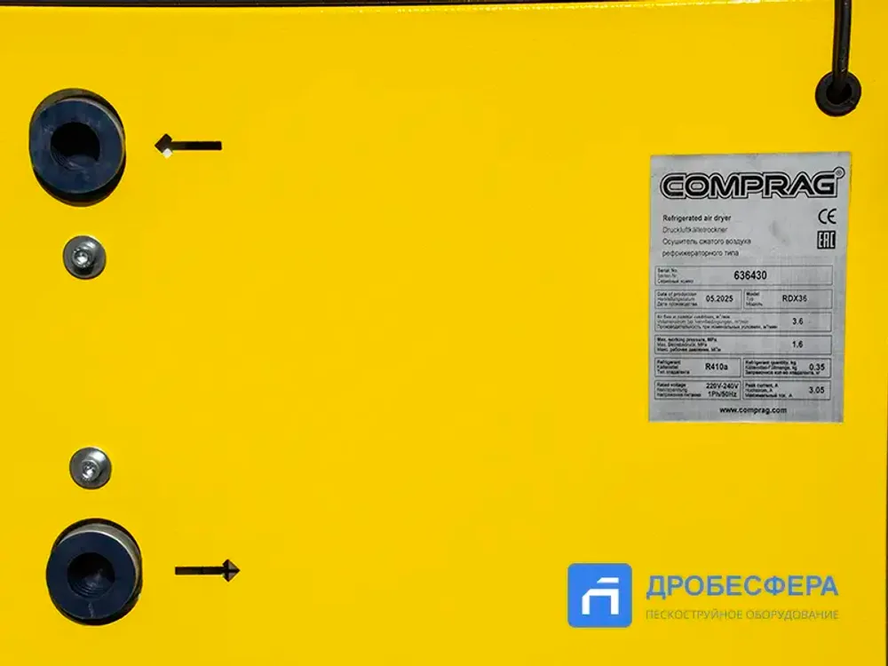 Рефрижераторный осушитель COMPRAG RDX-36 с помощью фреона R404A охлаждает воздушные массы до точки росы +3 °С. Компрессор нагнетает горячий хладагент в конденсатор, где, проходя по системе через фильтр водоотвода по капиллярной трубке, сжимается, а затем возвращается в испаритель, в котором и происходит его охлаждение. Регулировка интенсивности охлаждения выполняется байпасным клапаном, который поддерживает давление в системе. Потребитель получает значение точки росы не ниже +3 °С.