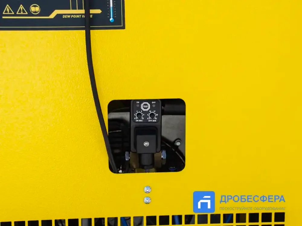 В осушителе предусмотрен таймер конденсатоотводчика. Как правило, конденсат выводится автоматически из системы, но в зависимости от окружающей среды или от количества влаги в сжатом воздухе, концентрация возможна разная. С помощью настроек, Вы можете выставить регулятор по продолжительности времени открытия клапана и регулятором установить частоту открытия. Но не забываете проверять каждую смену работу конденсатоотводчика.