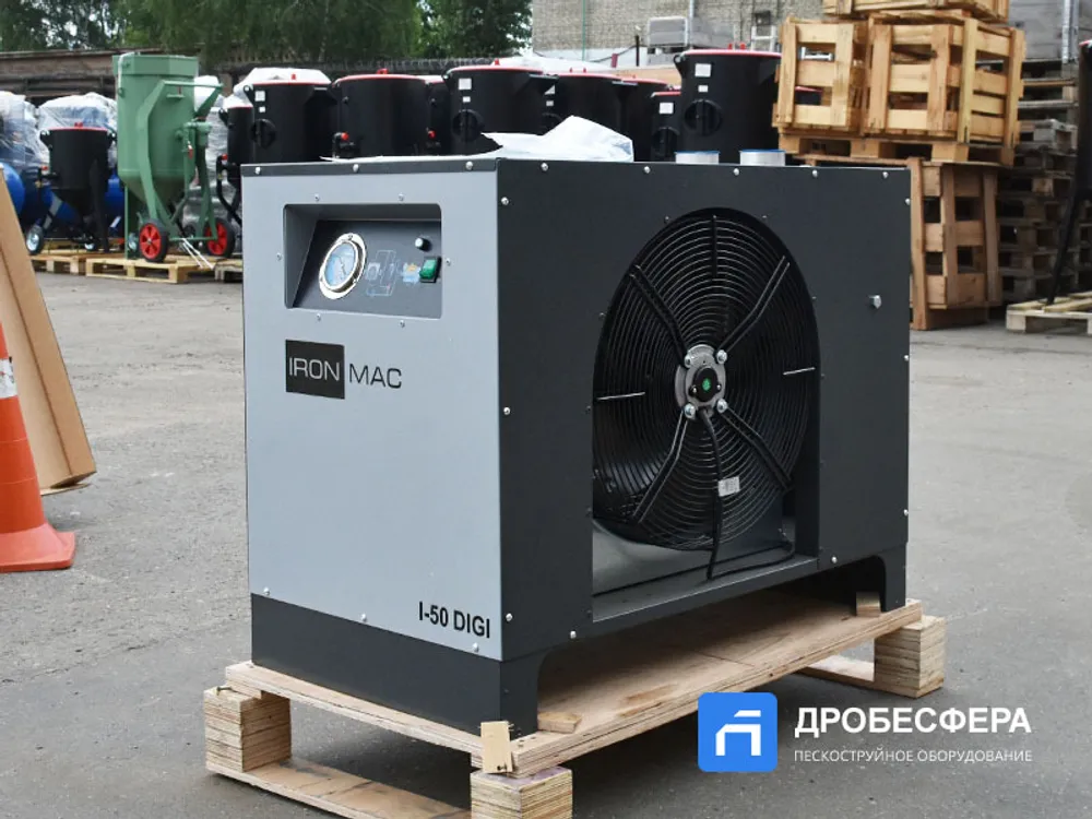 При эксплуатации нагнетателей пневморесурса стандартного качества и использовании пневмооборудования с повышенными требованиями к влажности энергоносителя рекомендуем дополнить пневмосистему таким устройством как рефрижераторный осушитель сжатого воздуха IRONMAC I-50 DIGI.