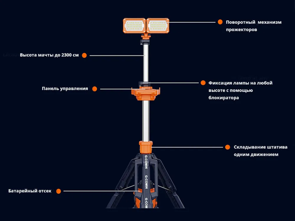 Осветительная мачта LT1300 2,3 метра с одним аккумулятором D24-100 и 2-мя лампами 15000 люмен