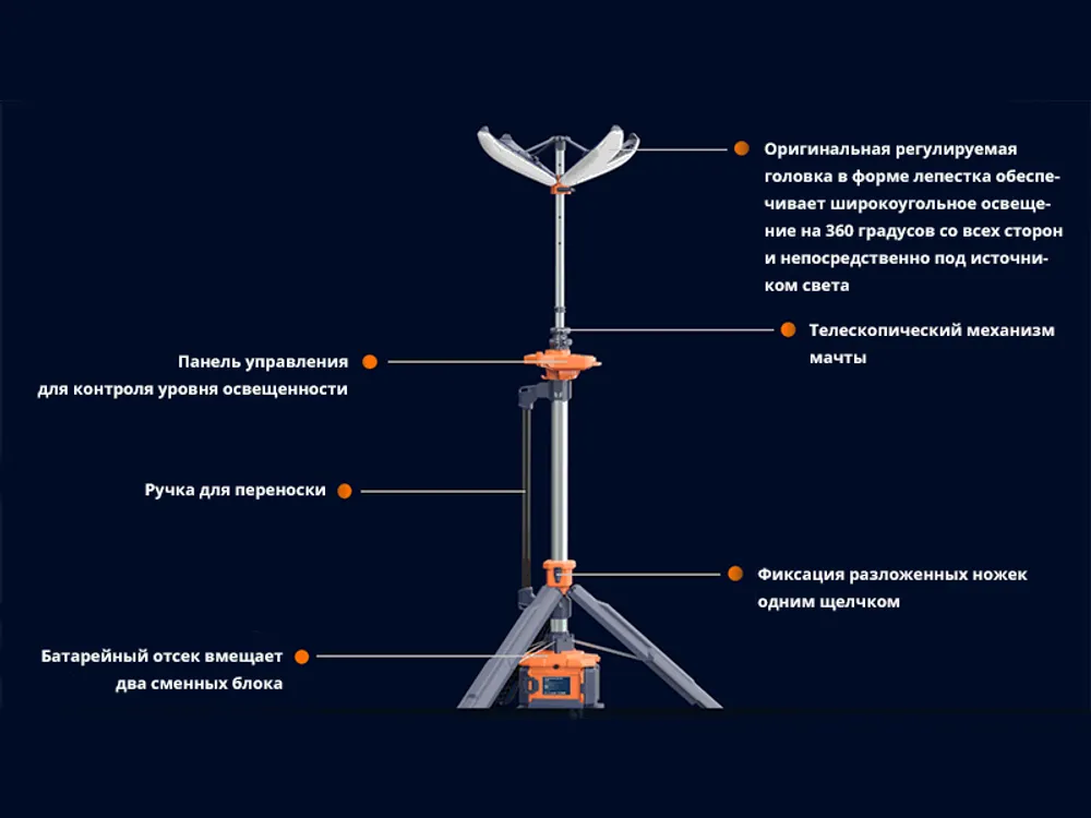 Осветительная мачта LT1400 2,5 метра с двумя аккумуляторами D24-100 и 4-мя лампами короной 11000 люмен