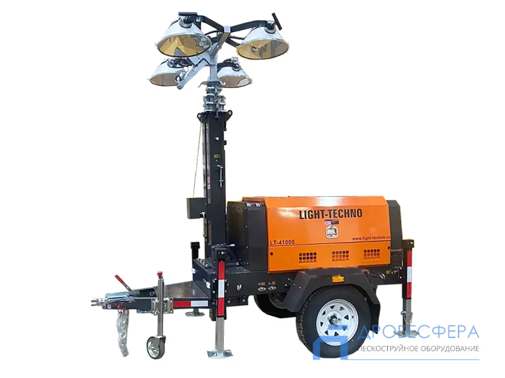 Возможность работы в таких условиях обеспечивают передвижные осветительные мачты Light-Techno LT41000. Мачта монтируется на металлическом корпусе, в котором размещен дизельный двигатель Laidong KM385B с электрогенератором.
