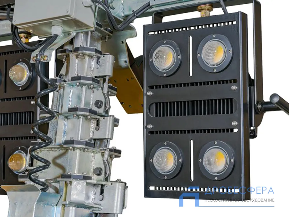Оснащение 4-мя светодиодными лампами мощностью 500 Вт обеспечивают мощность светового потока для освещения территории площадью до 6000 кв. м. при освещенности в 40 люкс и до 30000 кв. м при освещенности до 7 люкс.