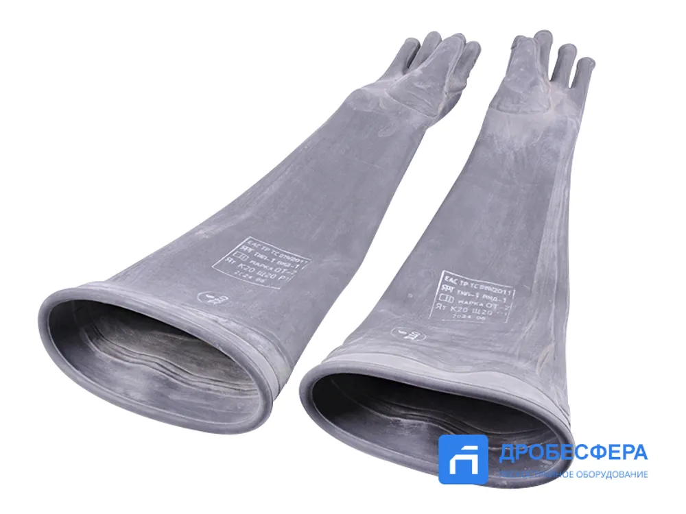 Поскольку при эксплуатации пескоструйной камеры, не оснащенной поворотным очистным барабаном, предусматривается работа оператора, то защиты рук работника применяются специальные перчатки, которые прикрепляются к отверстиям, сделанным в стальном корпусе кабины.