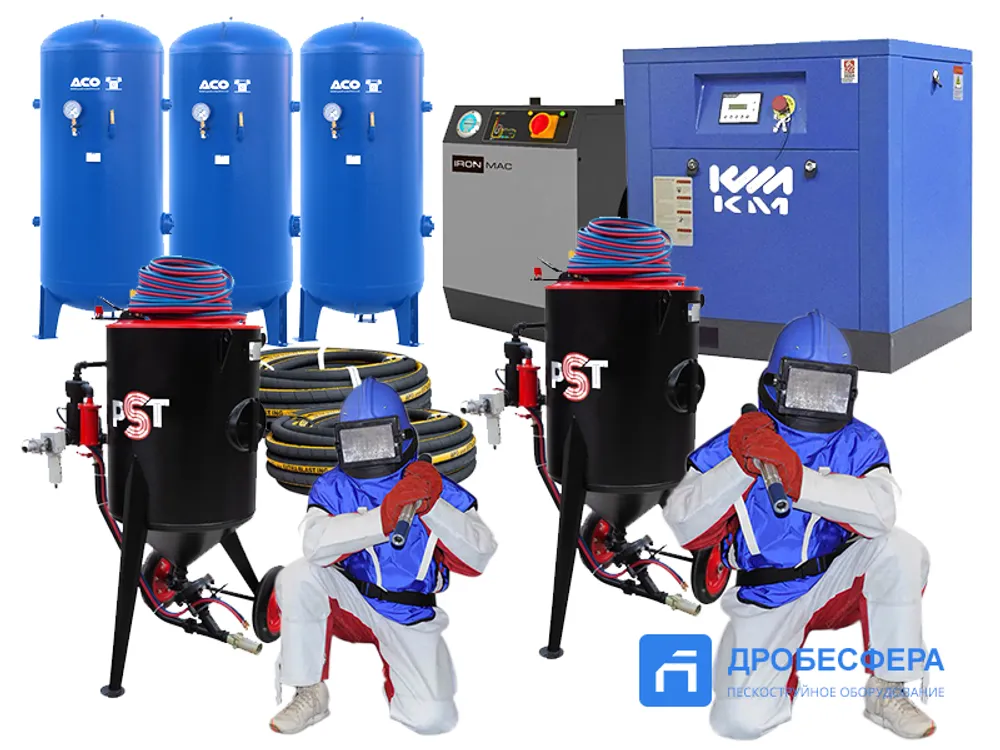 Два аппарата объемом по 250 литров с универсальными дозаторами, позволяющими работать не только песком и купершлаком, но другими абразивами, в том числе и тяжелыми – типа стальной или чугунной дроби.