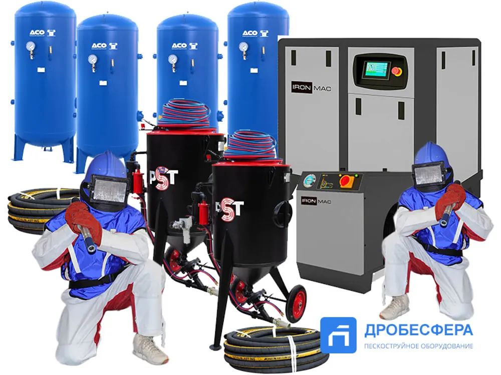В основе – компрессор мощностью 132 кВт. Полная подготовка воздуха, все необходимые рукава, фитинги, защита оператора и прочее. В данном комплекте используется 2 пескоструйных поста с большими соплами 12,7 мм.