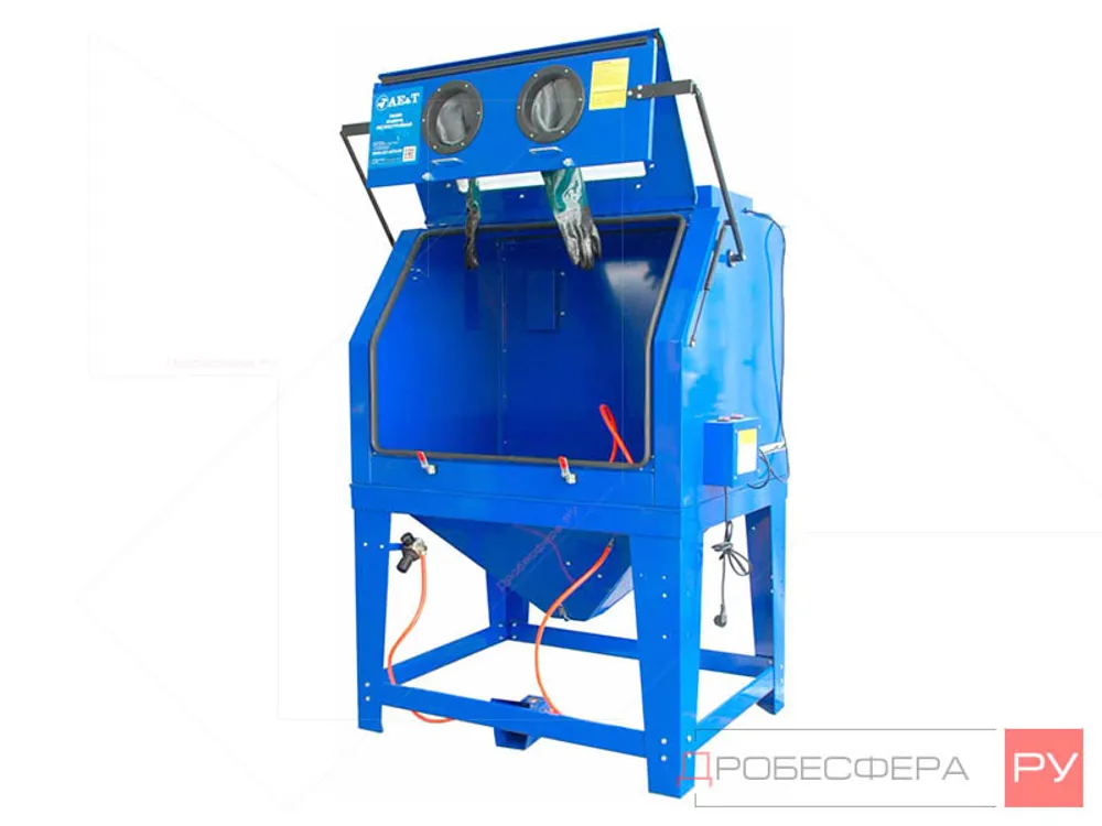 Пневмопоток должен быть «сухим», чтобы обеспечить высокую эффективность обработки. Влажный абразив приведет к перерасходу ресурсов и низкой интенсивности воздействия на поверхность. Общий объем резервуара камеры составляет 990 литров.