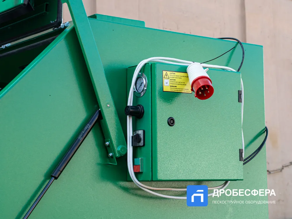 В комплектацию входит герметичная камера для пескоструйной обработки, которая имеет смотровое окно и отверстия с перчатками, куда оператор помещает руки. Т