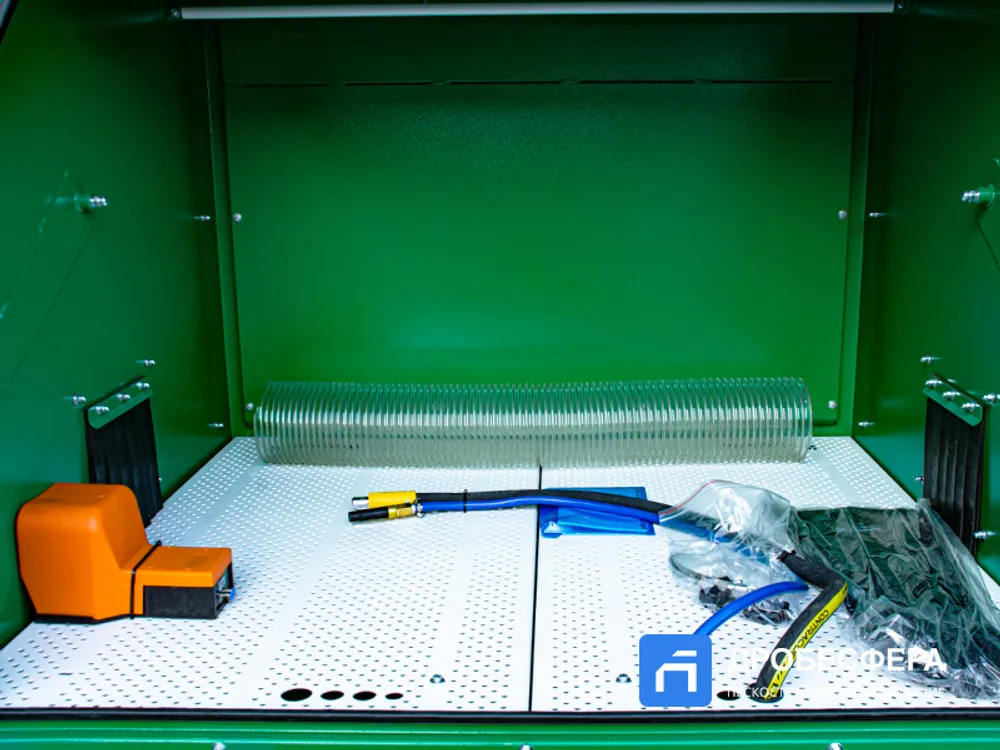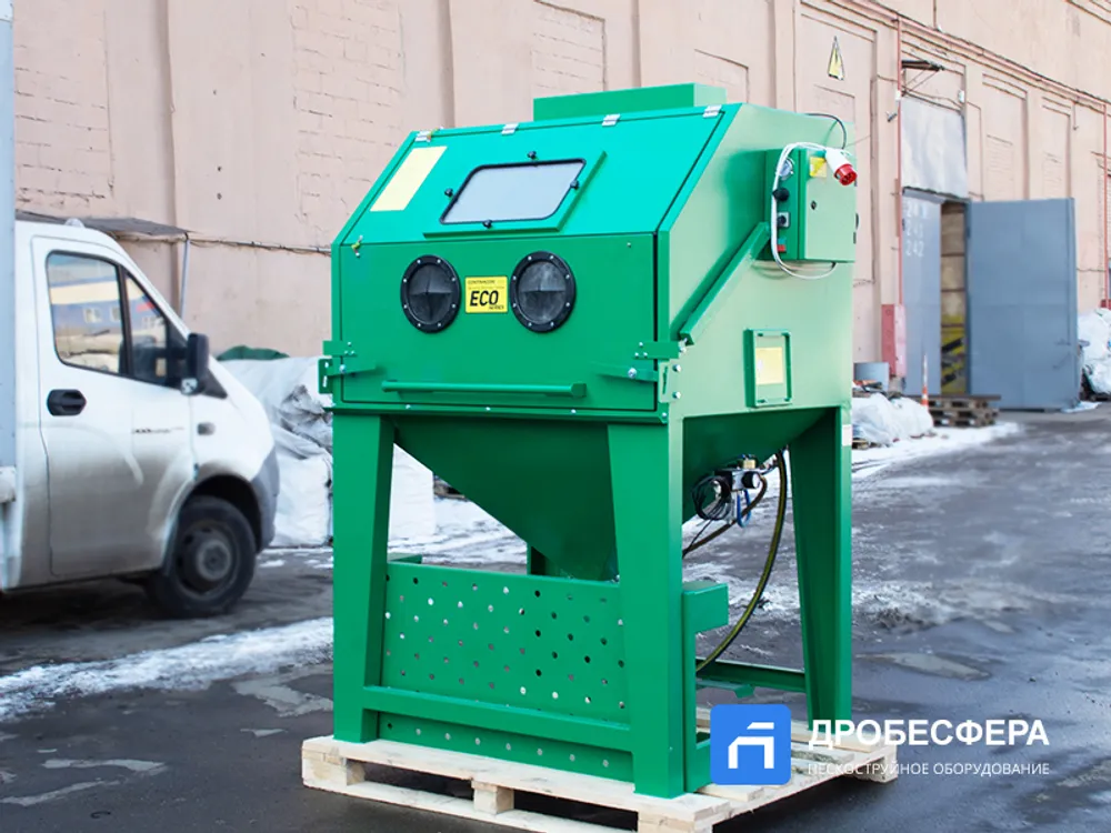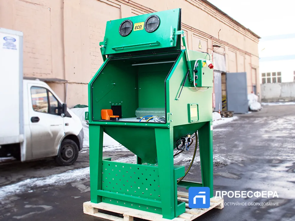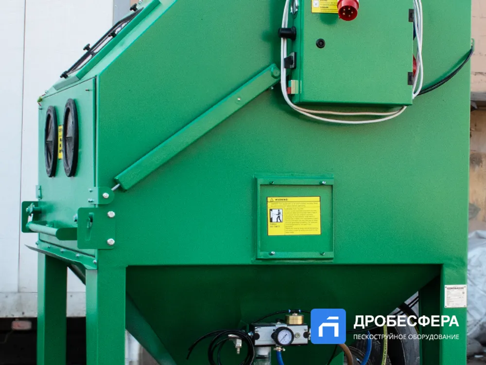 Данная модель относится к оборудованию простейшей комплектации и требует дополнительно обустройства вытяжной вентиляции камеры и рекуперации абразивной смеси. Также необходимо обеспечить подключение к компрессорной сети предприятия или к автономному компрессору соответствующей производительности.