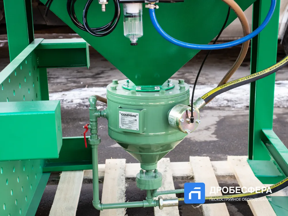 Использованная абразивная смесь вместе с мусором попадает в емкость под камерой. Затем ее можно просеять (очистить) и использовать снова. Автоматическая рекуперация в данной модели камеры не предусмотрена.