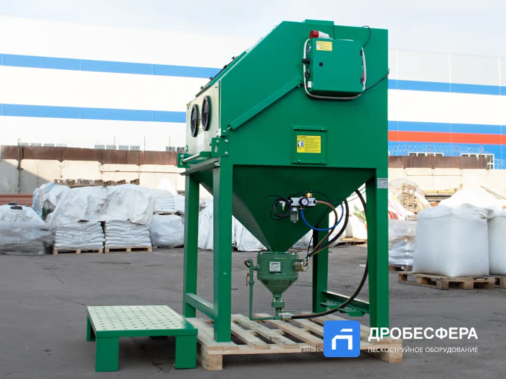 В загрузочный бункер минимально загружается 20 кг абразива. Для подключения пескоструйной камеры обеспечивается подвод трехфазной энергосети напряжением 380 вольт.