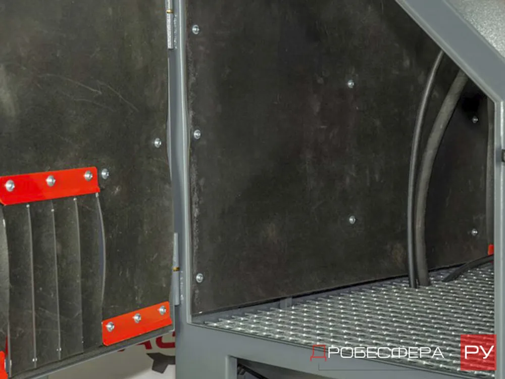 Наличие в камере внутренней отделки рабочей камеры резиной. Резина амортизирует удары абразива, защищая металлические элементы от износа.