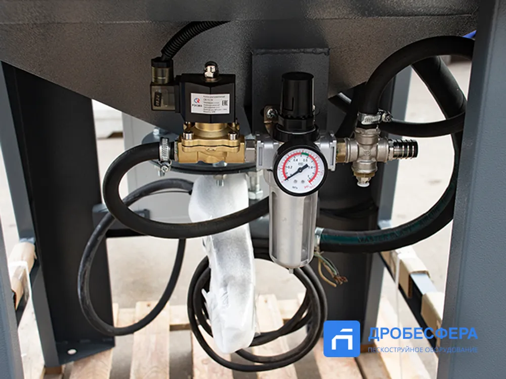 Процесс обработки можно регулировать, настраивая дозатор абразива, который расположен под бункером пескоструйной камеры. Расход воздуха, на который необходимо ориентироваться при выборе компрессора, зависит от диаметра абразивного и воздушного сопел, а также от рабочего давления сжатого воздуха.