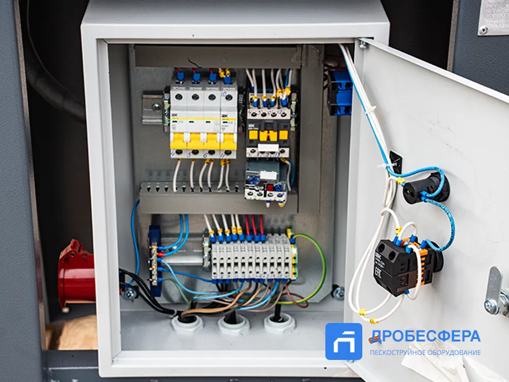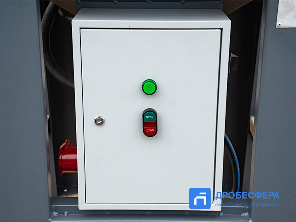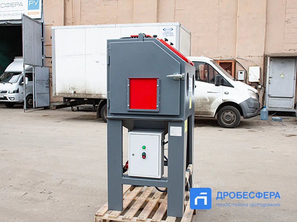 Функционал запускается при нажатии оператора ногой на педаль, расположенную под камерой. Работоспособность камеры обусловлена наличием абразивного пистолета эжекторного типа. Для повышения эффективности обработки установка оснащена обдувочным пистолетом.