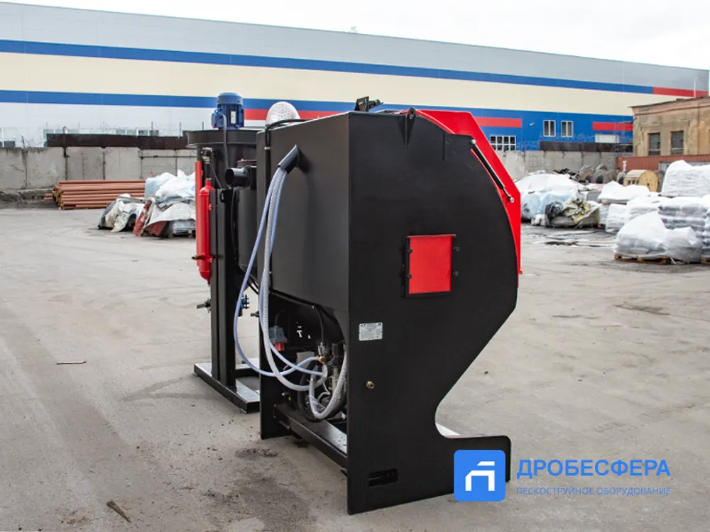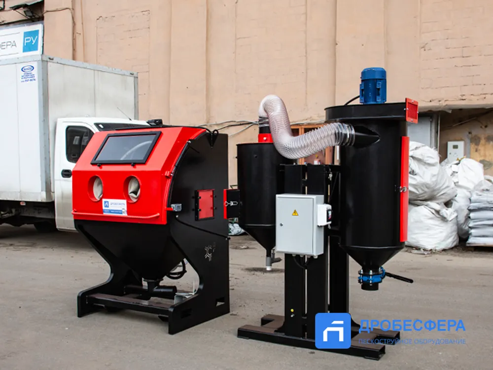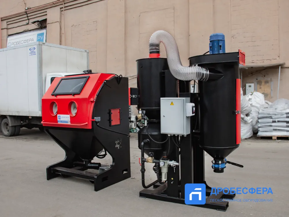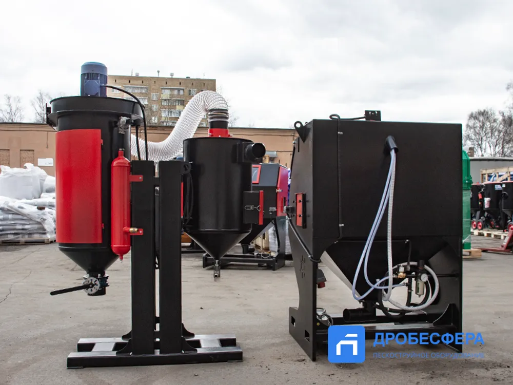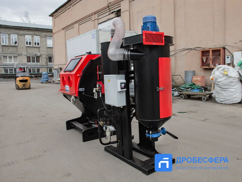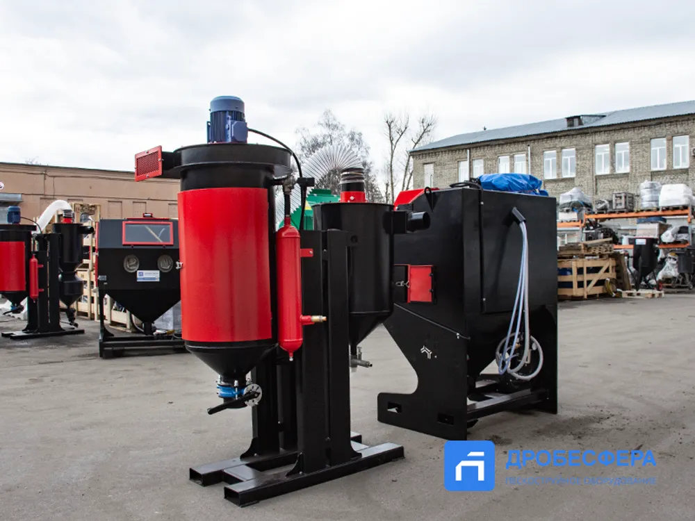 Принудительная (механическая) – абразив поступает обратно в ёмкость за счет тяги вентилятора, ёмкость при этом расположена рядом с кабиной. Также в процессе механической рекуперации абразив проходит через циклонный сепаратор, очищаясь от мелких фракций.