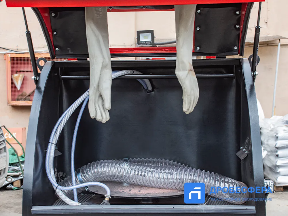 Для оператора предусмотрены отверстия на передней стенке камеры с перчатками, защищающими руки от механических повреждений абразивом, токсичности пыли и статических разрядов. Отслеживание процесса осуществляется через смотровое окно. Выносная педаль упрощает эксплуатацию.