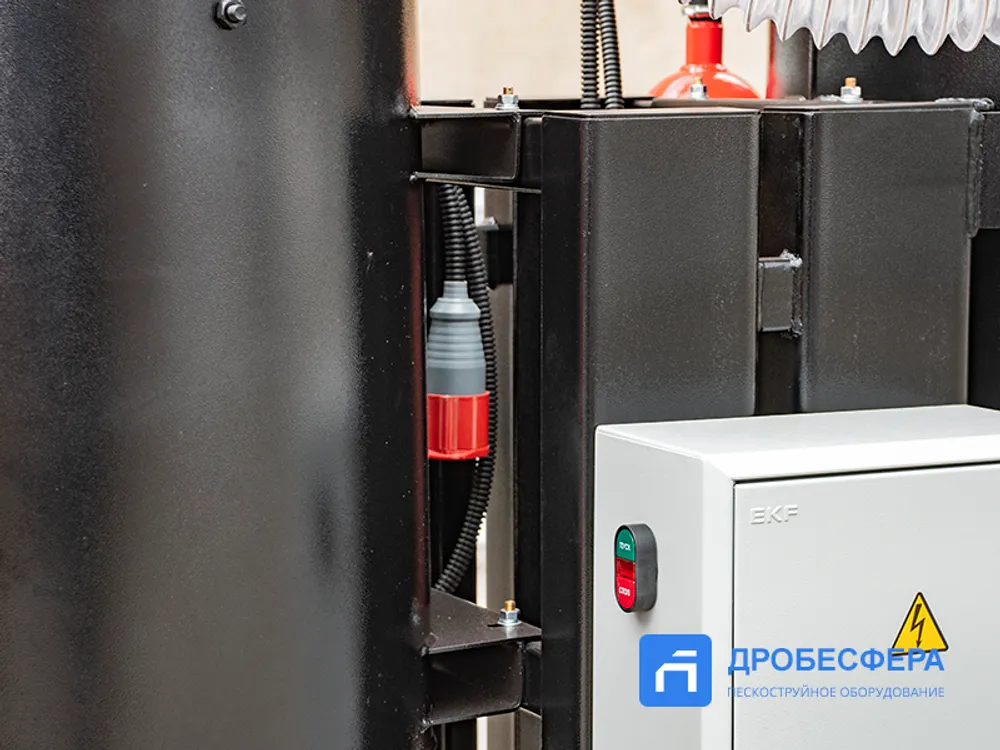 Камера подключается к электросети напряжением 380 вольт. Воздух и абразив подаются к соплодержателю по разным рукавам. Нет необходимости подключать камеру к вентиляции.