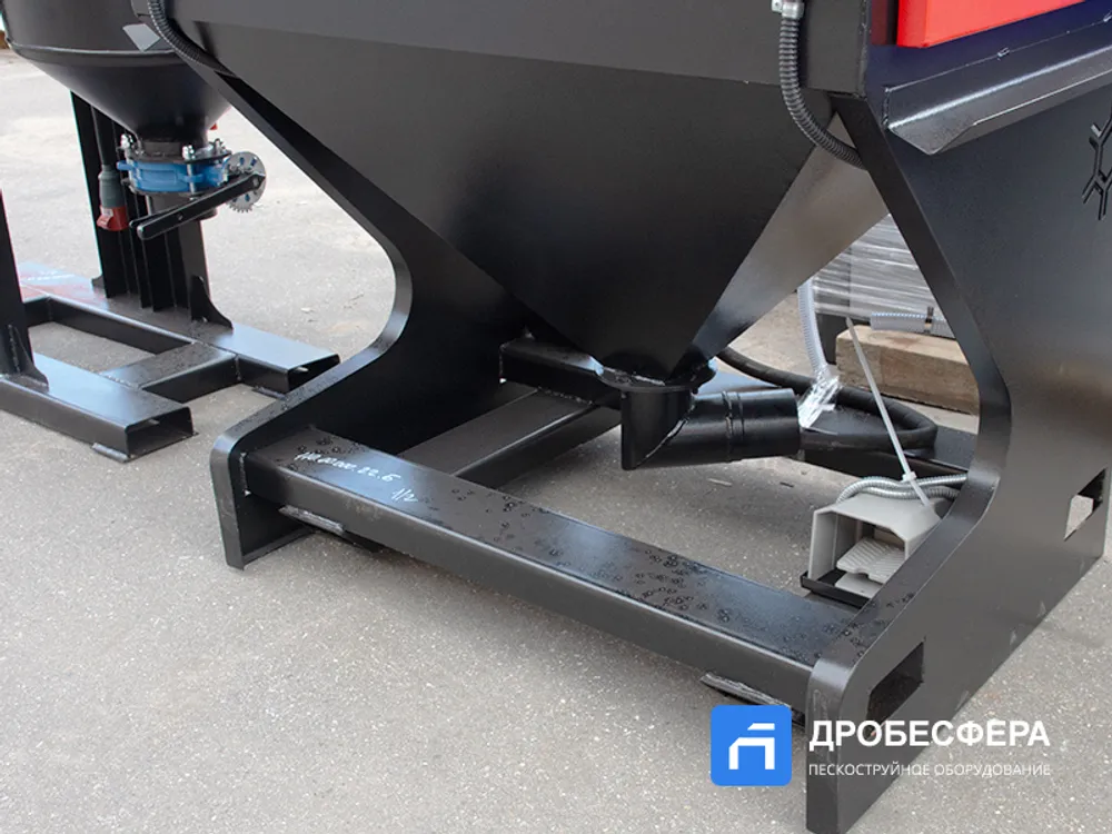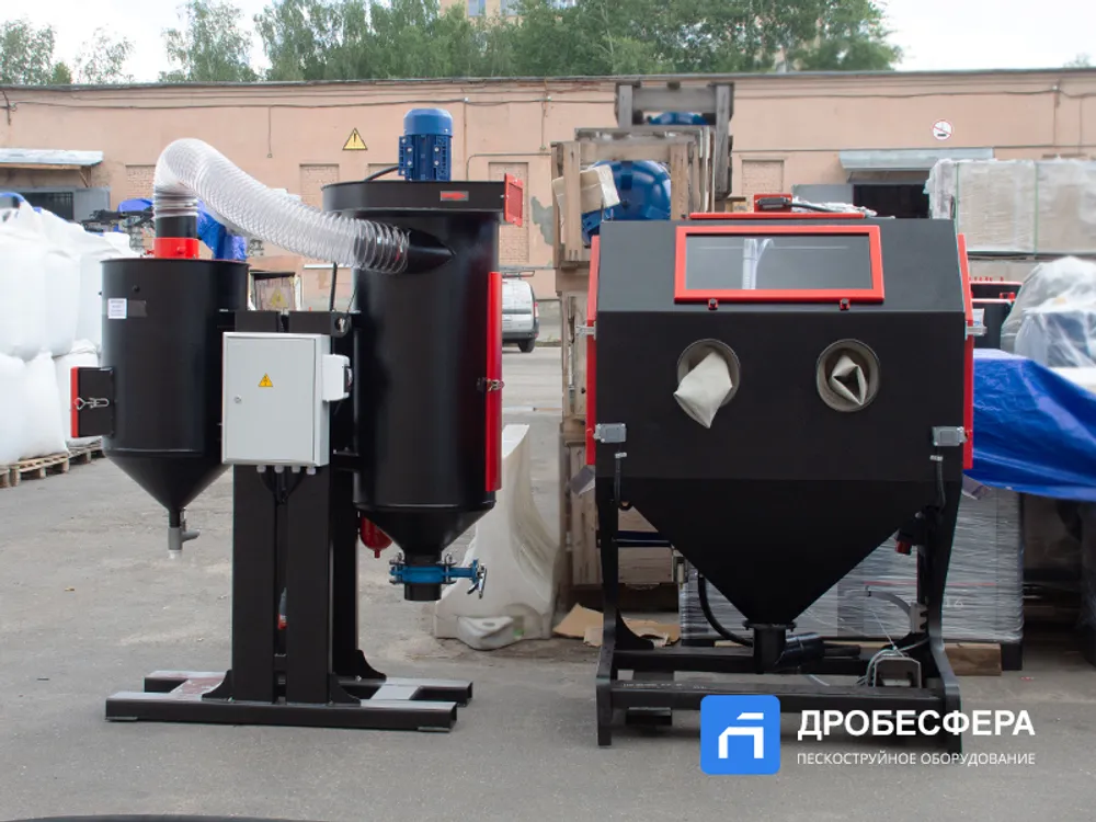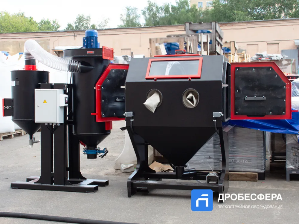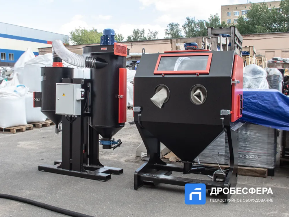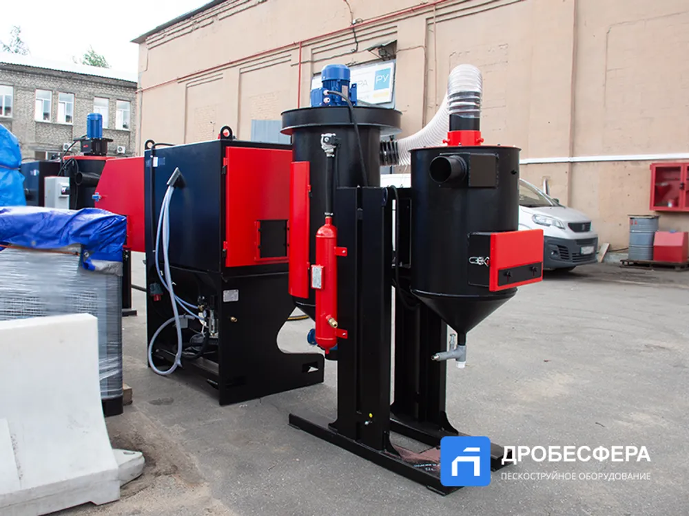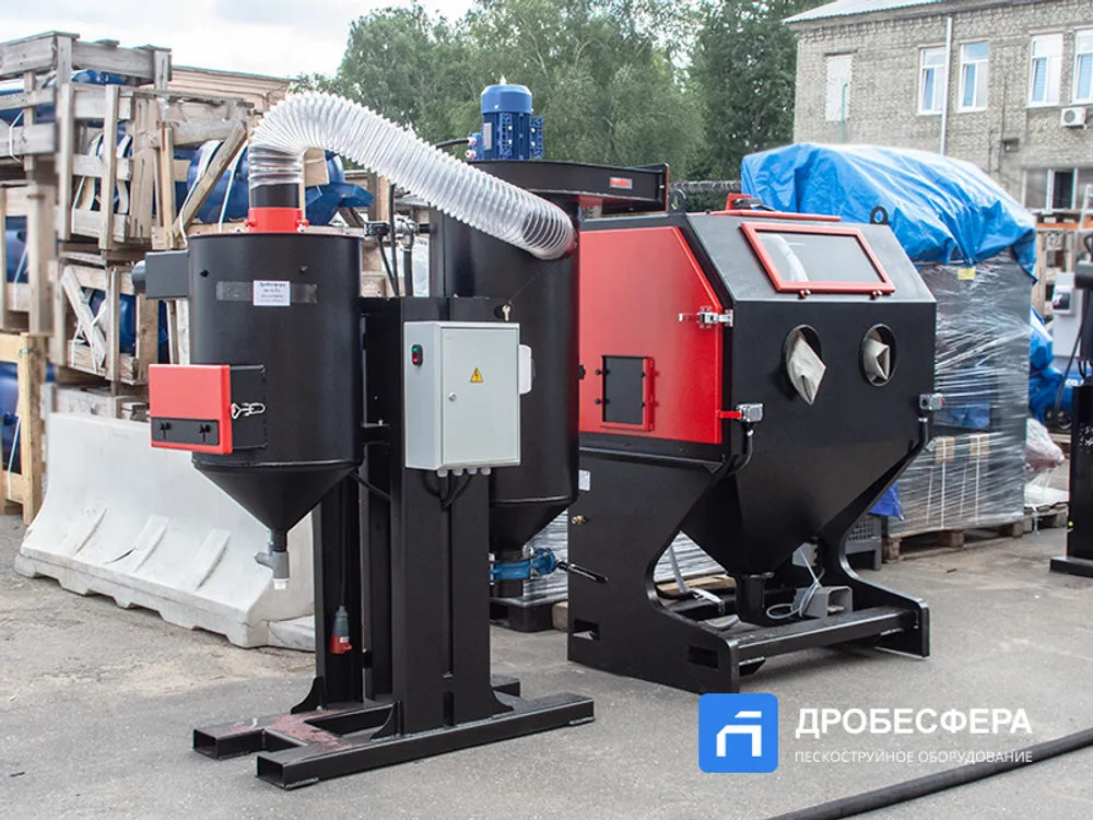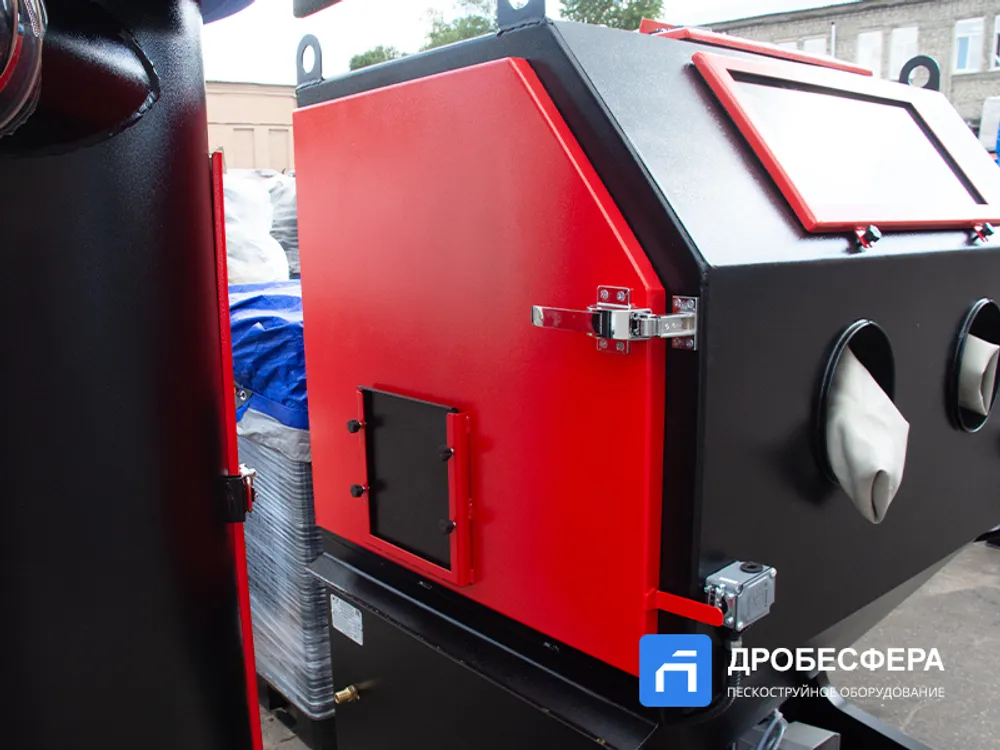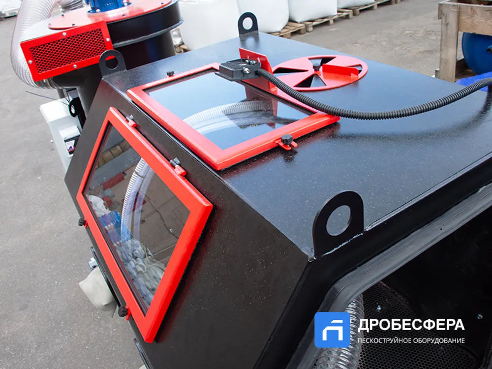 Также в конструкции агрегата имеется рекуператор абразива, который очищает отработанную массу абразивных частиц от мусора. Кабина имеет обширное смотровое окно, которое вместе со светодиодным прожектором обеспечивает достаточный обзор происходящего во внутреннем пространстве.