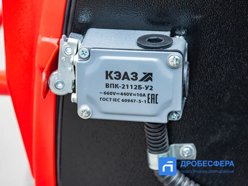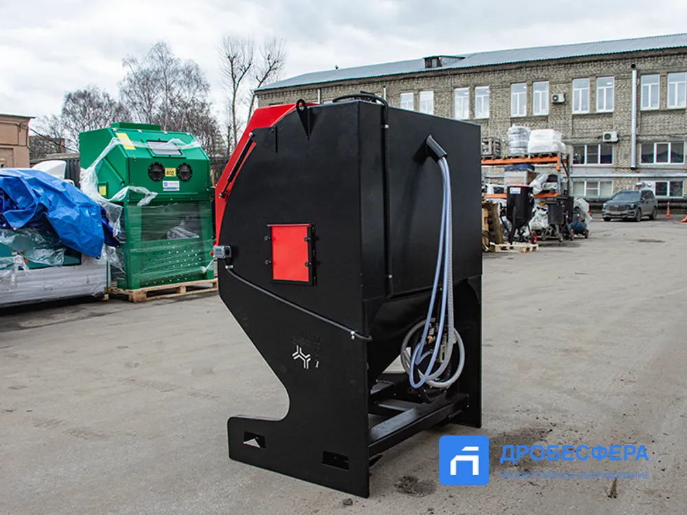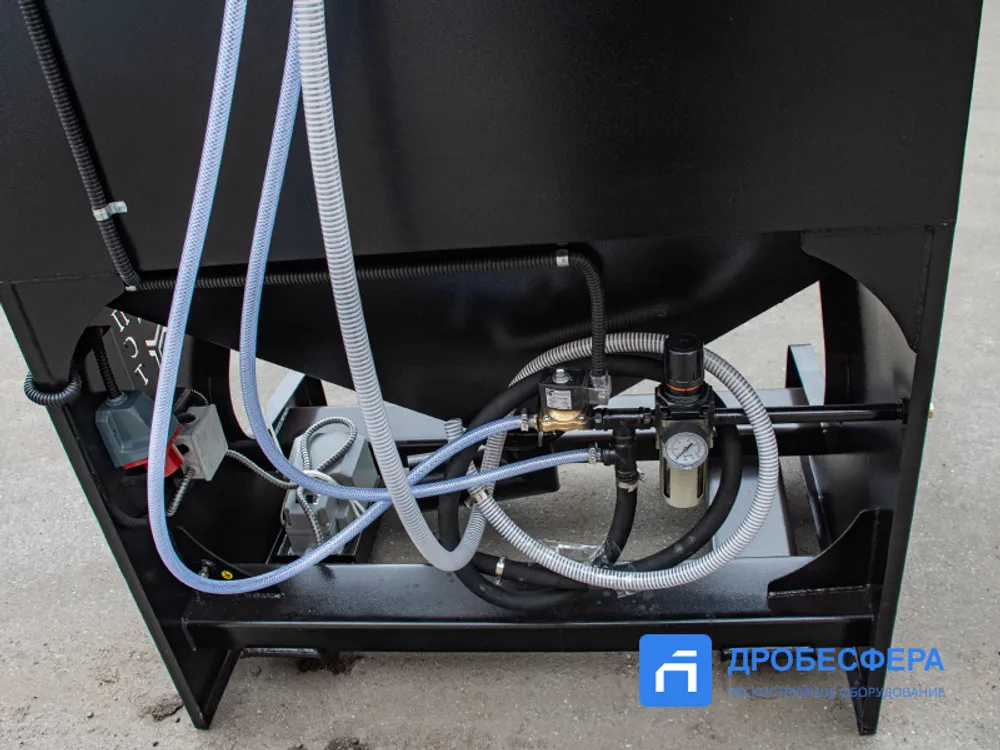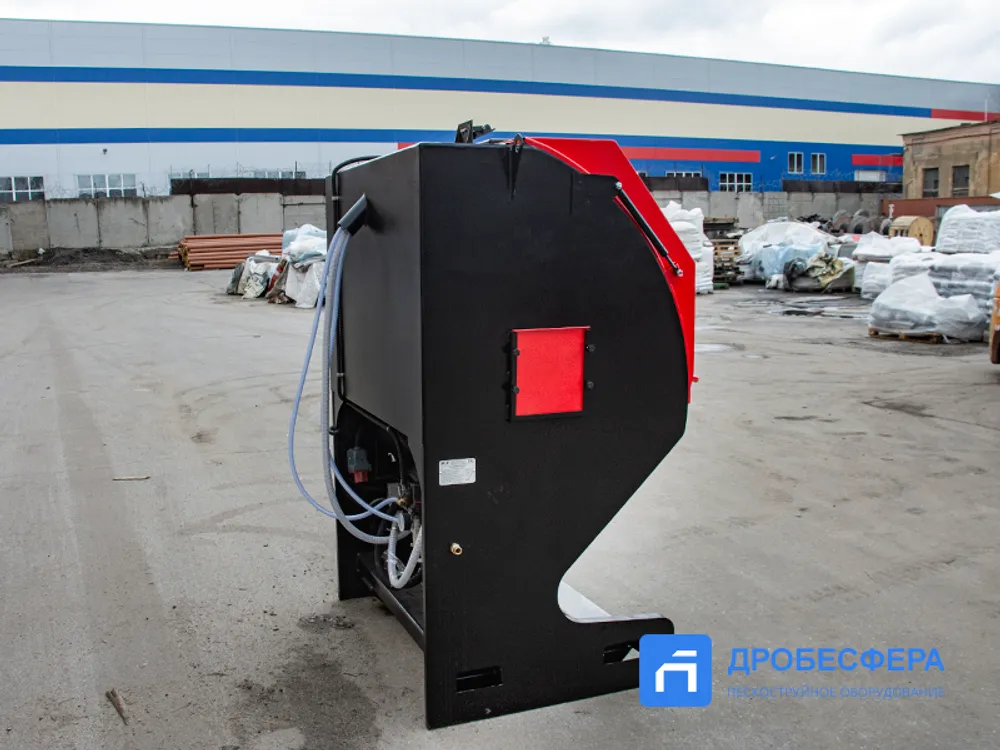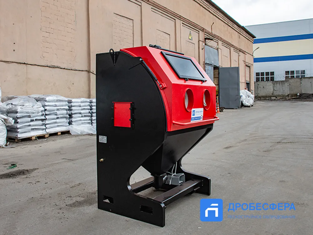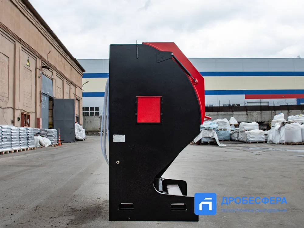 На фронтальной стенке предусмотрены отверстия с перчатками для рук оператора, нивелирующими воздействие абразива и статического тока. Следить за процессом обработки можно через удобное смотровое окно.