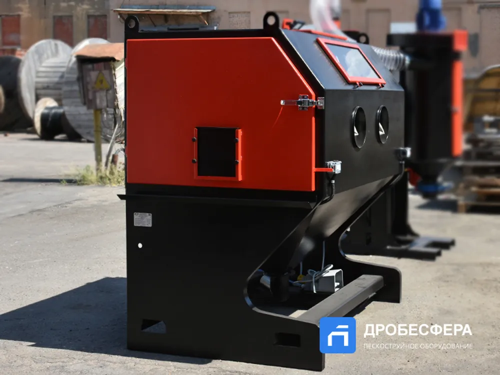Отработанный состав периодически нужно выгружать из бункера в нижней части камеры, очищать, просеивать и загружать заново. Конструкция из листового металла предусматривает внутреннюю футеровку кабины, что исключает преждевременный износ корпуса.
