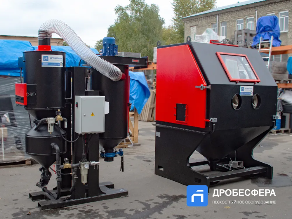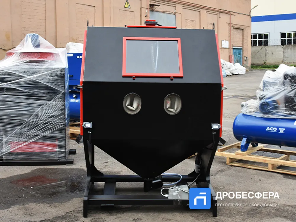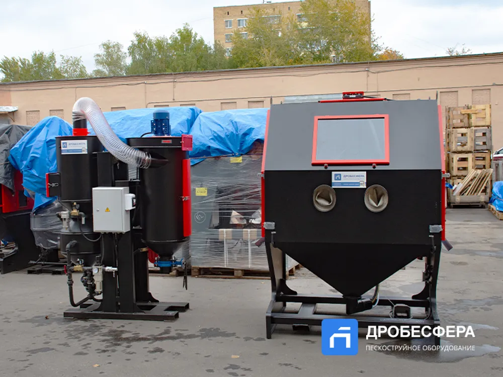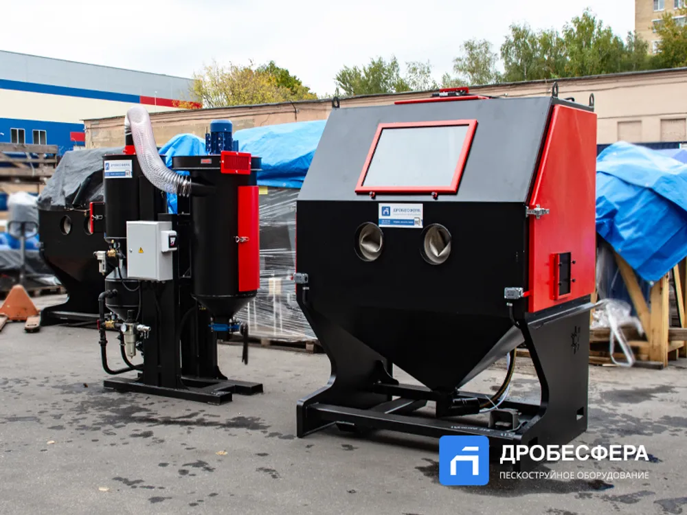 Это стационарное оборудование представляет собой целый комплекс, обеспечивающий беспылевой способ абразивной обработки деталей, которые загружаются в камеру на решетку или поворотный стол через боковую дверцу.