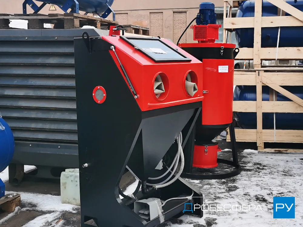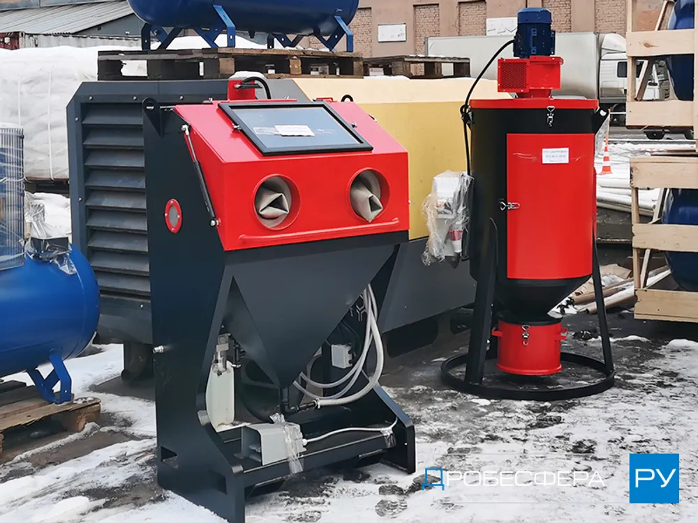 Это стационарная модель эжекторного типа, подключаемая к электросети напряжением 380В и позволяющая обрабатывать в час до 3 квадратов поверхностей деталей из разных материалов.