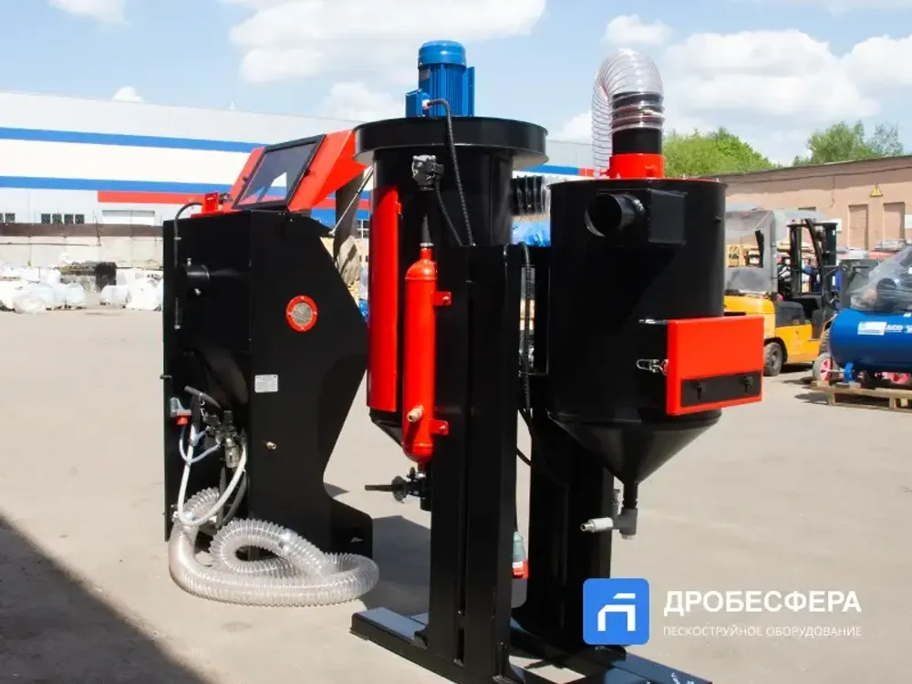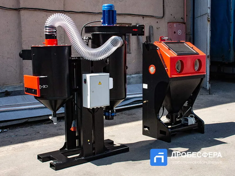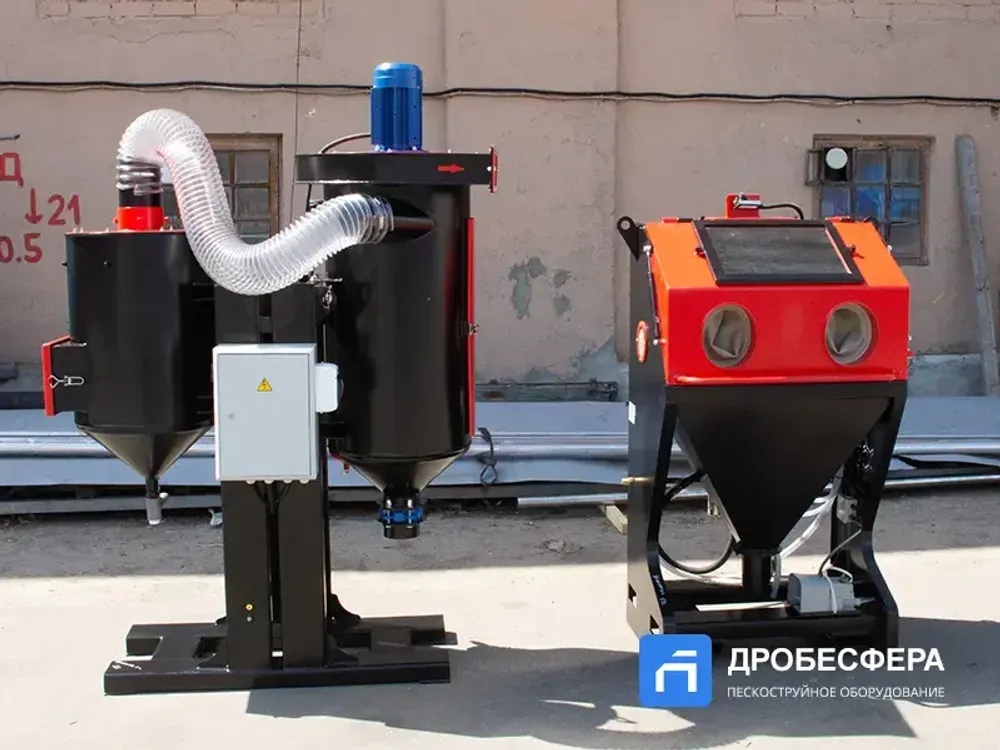 Принудительная (механическая) – абразив поступает обратно в ёмкость за счет тяги вентилятора, ёмкость при этом расположена рядом с кабиной. Также в процессе механической рекуперации абразив проходит через циклонный сепаратор, очищаясь от мелких фракций.
