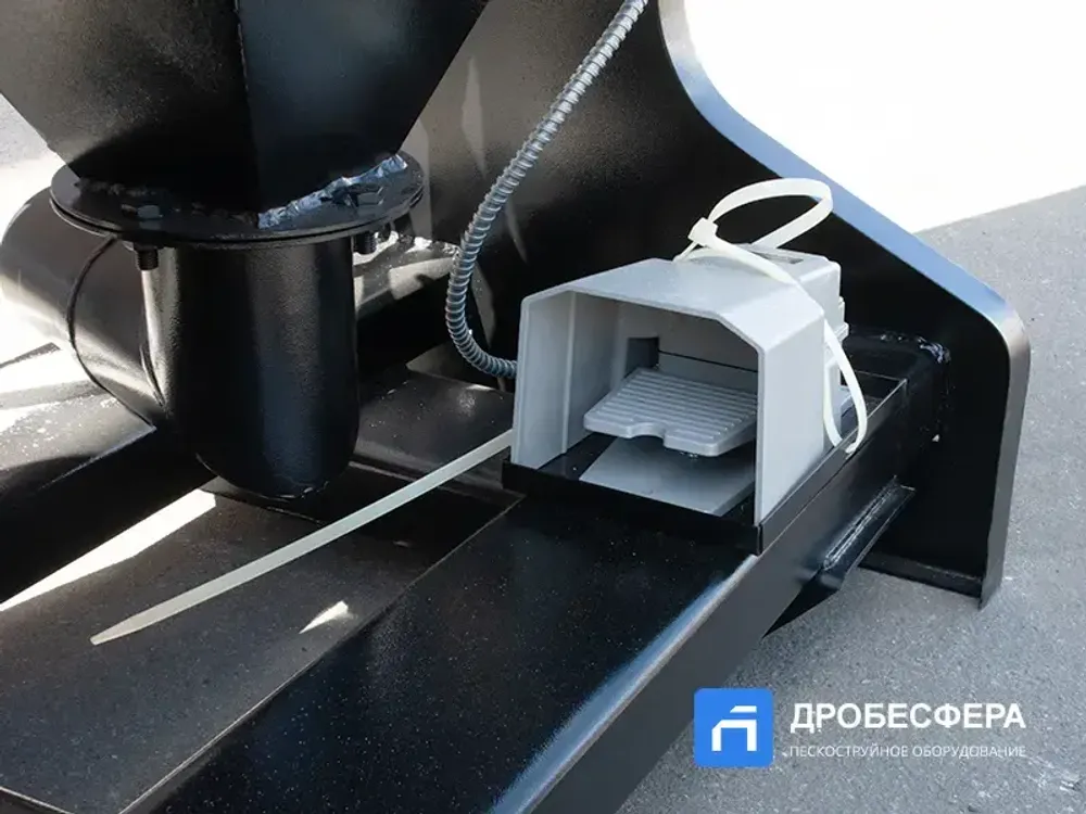 - педаль, размещенная под камерой, благодаря которой пескоструйщик запускает и останавливает процесс очистки, регулирует интенсивность подачи абразива;