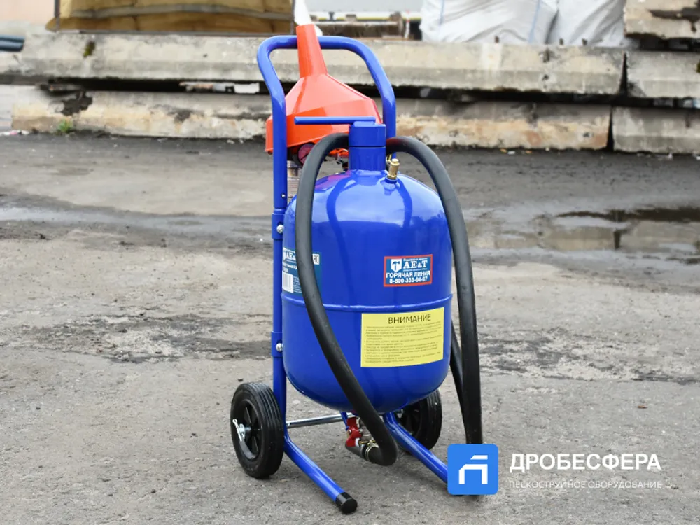 Пескоструйный аппарат напорного типа характеризуется компактностью и сравнительно небольшим весом. Конструкция имеет бак для загрузки абразивного состава, керамическое сопло, пистолет на шланге длиной 2,5 метра.