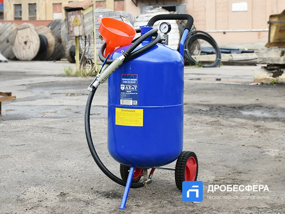 Аппарат устроен как тележка, на которой установлен бак емкостью 76 литров. Транспортировочная ручка и колеса обеспечивают возможность перемещения в пределах рабочей площадки или мастерской. Это удобно с учетом веса, который имеет абразив, загруженный в бак.