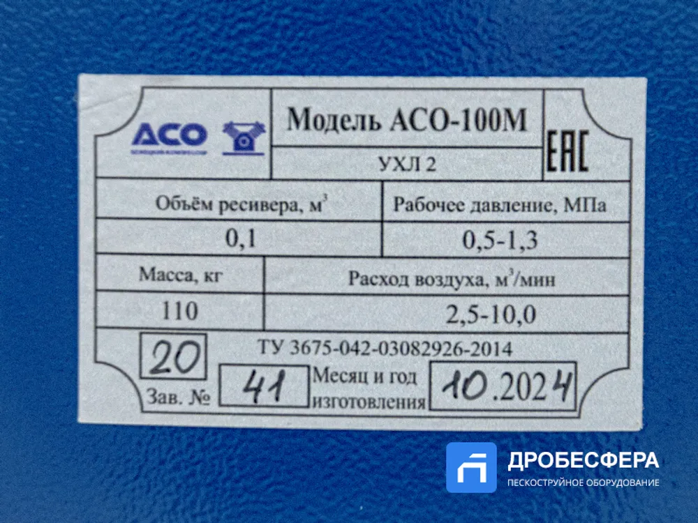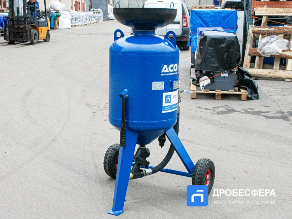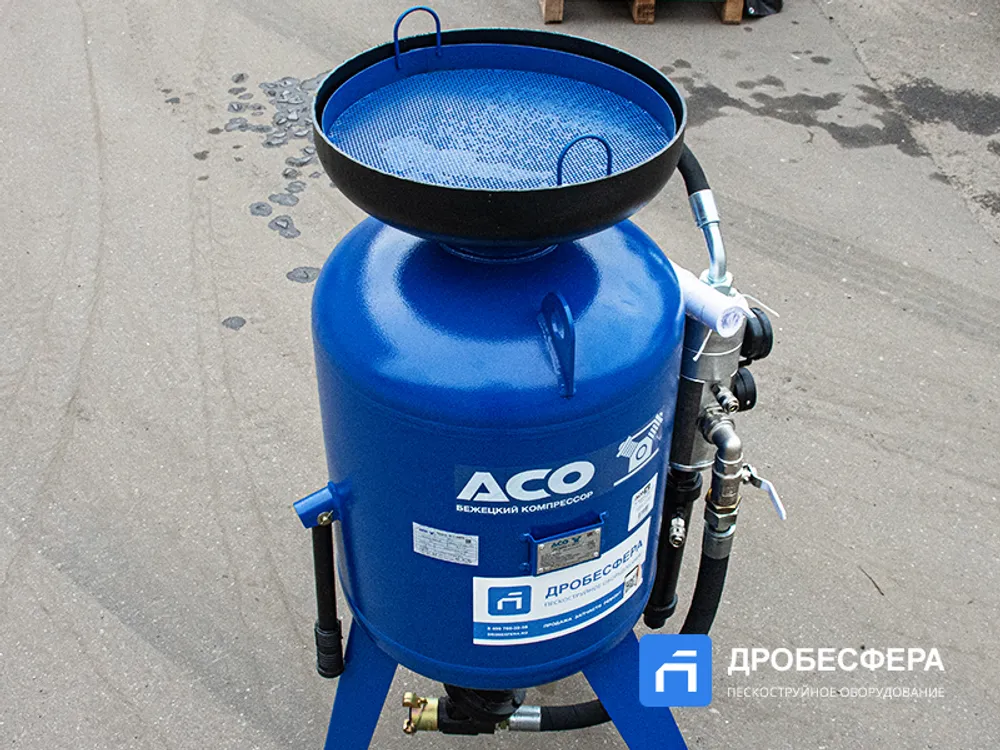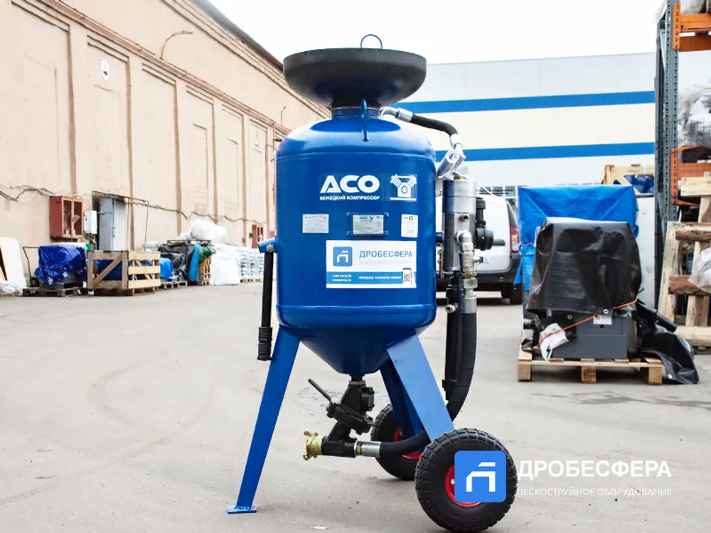 При выборе техники для струйной очистки поверхностей в значительных масштабах рекомендуем сравнительно бюджетный вариант от Бежецкого завода АСО — пескоструйный аппарат АСО 100М в базовой комплектации.