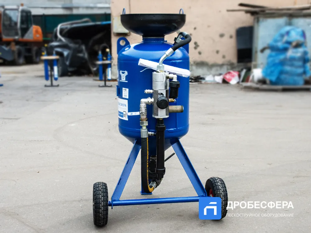 Конфигурация отличается наличием шиберного затвора и требует дополнительного приобретения пескоструйного рукава, системы ДУ (при необходимости), системы вакуумного сбора и рекуперации абразива для его экономного расходования и влагоотделителя для удаления влаги из поступающего в напорную емкость сжатого воздуха.