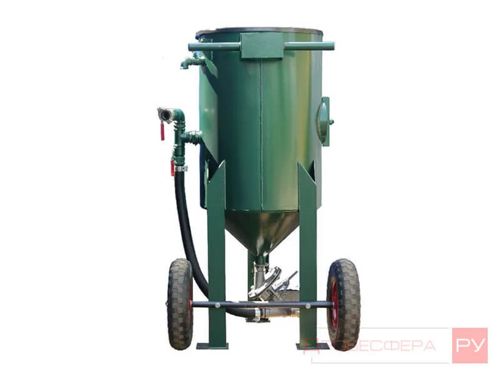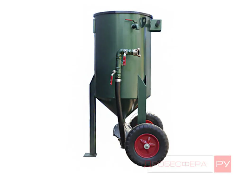 Это агрегат напорного типа с ситом, крышкой и дозирующим затвором для абразива. Передвижение в пределах рабочей площадки обеспечивает пара колес внушительного размера. Даже при полной загрузке абразивом такой агрегат несложно перемещать.