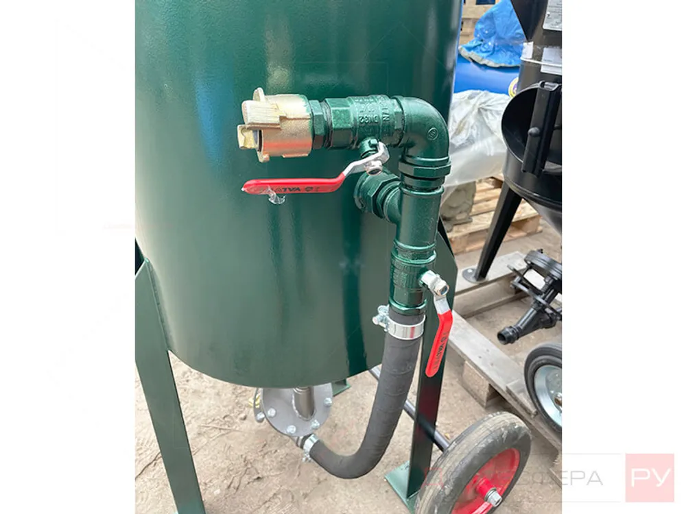 Для самостоятельной работы пескоструйщика необходим комплект оснащения для дистанционного управления, который этой конфигурацией не предусмотрен. При необходимости клапан и клавишу управления, а также сдвоенный шланг можно купить в отдельном порядке и дооснастить пескоструйный аппарат.