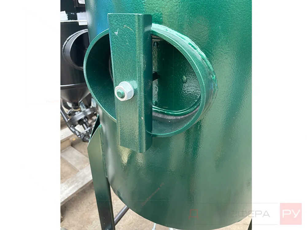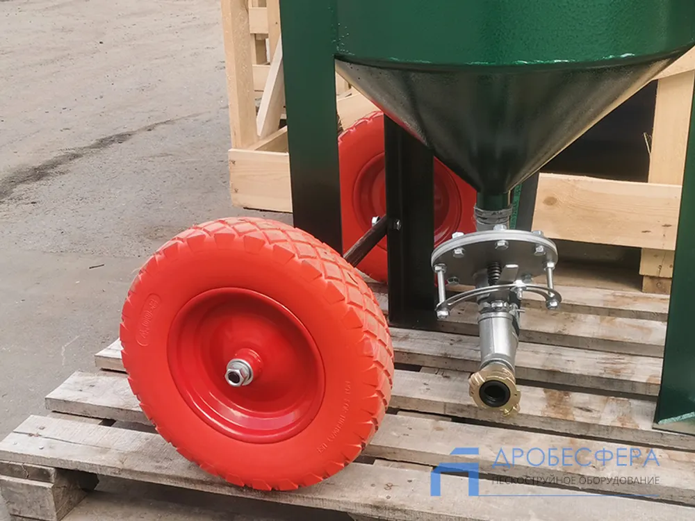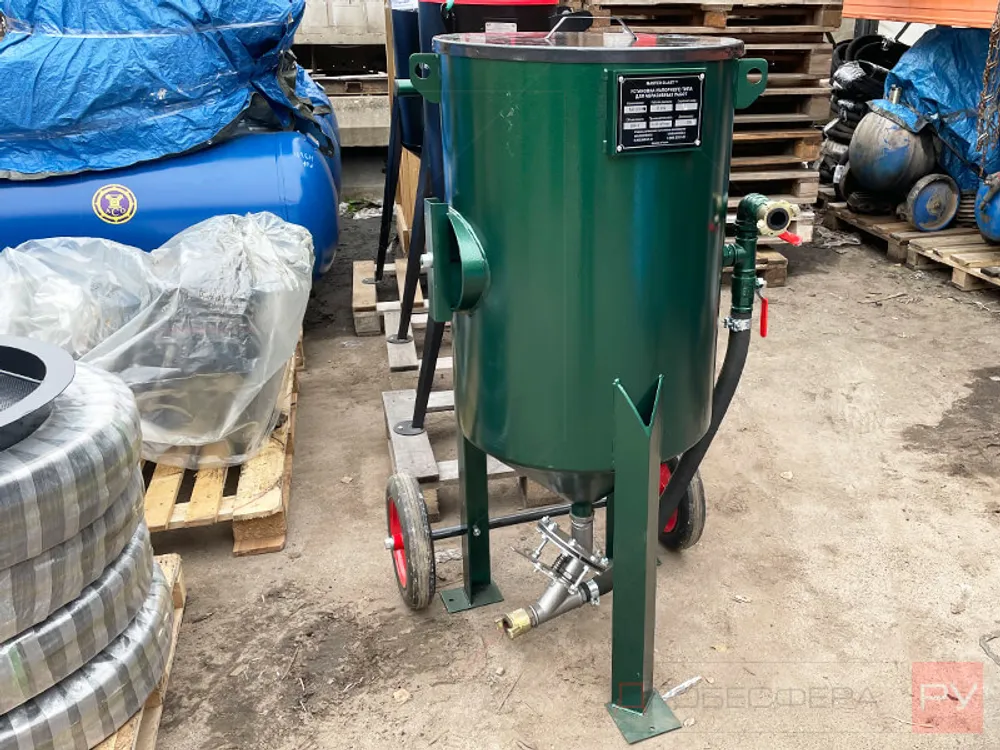 Конструкция из металла с порошковым покрытием для защиты от коррозии характеризуется наличием бункера объемом 200 литров для загрузки абразива, внизу которого имеется дозирующий затвор для песка или дроби. Применять можно любые абразивные составы.