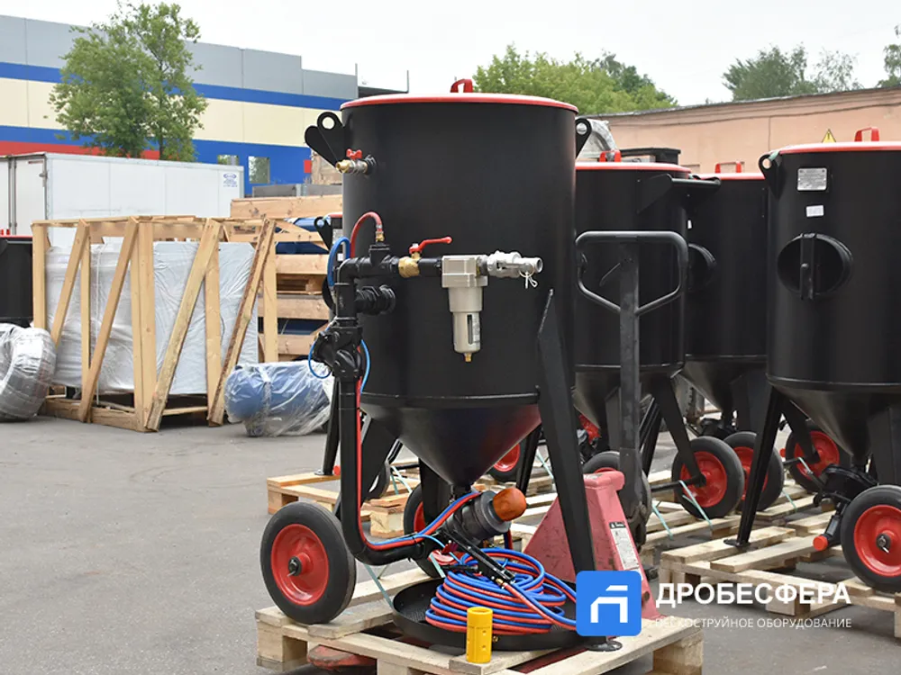 Если задачи по пескоструйной обработке предполагают поднятие сопла относительно аппарата более чем на 20 метров, рекомендуем рассматривать напорные установки на 13 бар.